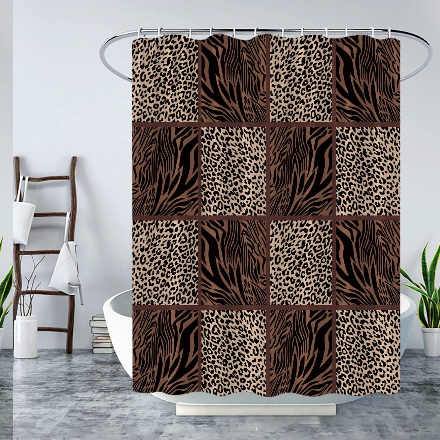 This shower curtain features a bold leopard print combined with geometric square and stripe splice patchwork patterns, creating a wild safari-inspired design. Made from quick-drying, soft 100% polyester fabric, it offers durability and easy maintenance. The creative and unique pattern adds a fun, personalized touch to your bathroom, transforming the space with an artsy, fashionable look. The curtain measures various sizes, including options from 70x70 inches up to 70x96 inches, accommodating different bathroom dimensions. It is easy to install and use, coming with 12 plastic hooks for convenience. The vibrant, wild animal-inspired design brings a lively, adventurous vibe to your bathroom decor, making it a perfect gift for those who enjoy distinctive, creative styles. Enhance your space with this eye-catching, stylish shower curtain that combines functionality with artistic flair.