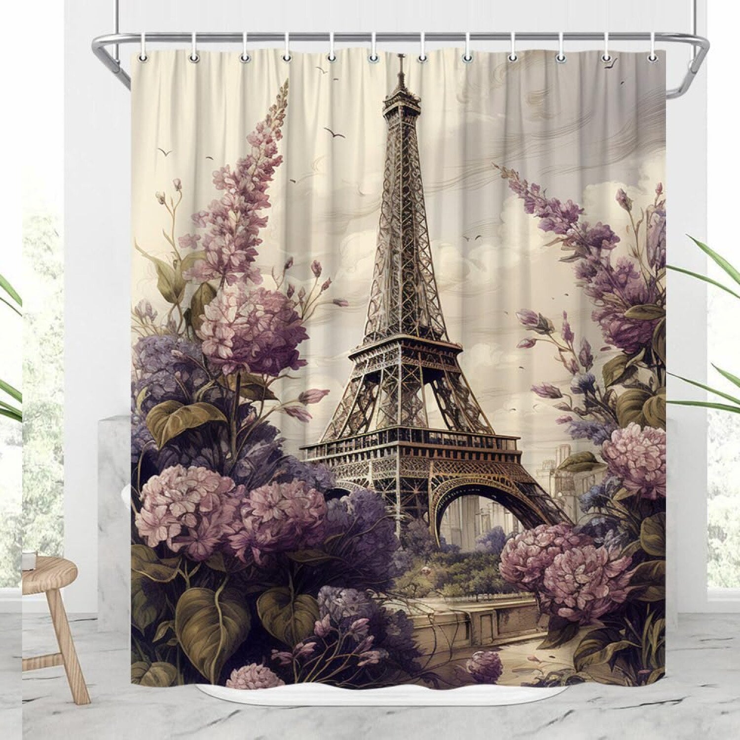 This shower curtain features an elegant design inspired by vintage Parisian scenes, showcasing the iconic Eiffel Tower, charming streets, and a lavender garden filled with wildflowers and plants. The rustic and nature-inspired artwork adds country charm and scenic beauty, creating a warm and inviting atmosphere in your bathroom. The purple and lavender hues enhance the natural aesthetic, making your space feel relaxing and tranquil. Crafted from high-quality polyester fabric, it helps keep your bathroom neat and fresh by allowing water to stay on the surface and fall like pearls. The curtain measures 70x70 inches, designed to fit most standard shower stalls. Reinforced buttonholes and a top hem ensure easy installation and a secure fit on your shower rod. Whether updating your bathroom decor or adding a vintage Parisian touch, this shower curtain offers a stylish and functional addition to your home.