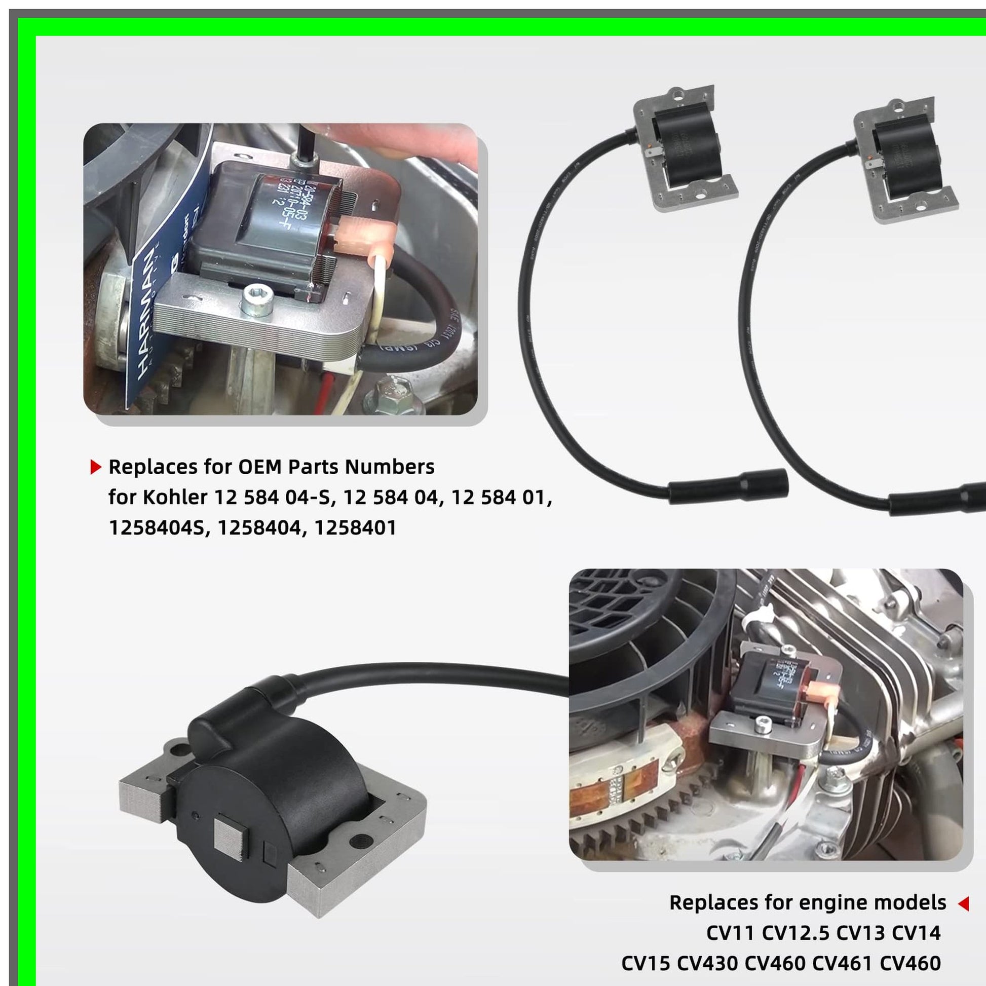 Revitalize your engine's performance with our premium replacement ignition coils, expertly designed to fit a wide range of engine models including CH11, CH12.5, CH13, CH14, and CV series. This high-quality ignition coil set is a perfect match for part numbers 12 584 04-S, 12 584 04, 12 584 01, and their equivalents, ensuring seamless compatibility and reliable operation.Crafted with precision, these ignition coils deliver optimal spark energy, enhancing fuel efficiency and overall engine performance. Whether you're tackling tough outdoor tasks or maintaining your lawn equipment, our ignition coils will help you achieve a smooth and powerful ignition every time. The package includes two ignition coils and a handy cleaning brush, making it easy to maintain your engine's components. The cleaning brush is perfect for removing debris and ensuring that your ignition system remains in top condition, prolonging the life of your equipment.Engineered for durability, our ignition coils are built to withstand the rigors of daily use, providing you with peace of mind and dependable performance. Say goodbye to misfires and poor engine starts—our ignition coils are your go-to solution for restoring your engine's power and efficiency.Upgrade your engine today with our reliable ignition coil replacement set and experience the difference in performance. Perfect for both DIY enthusiasts and professional mechanics, this ignition coil set is an essential addition to your toolkit. Don’t let a faulty ignition coil hold you back—invest in quality and reliability for your engine!
