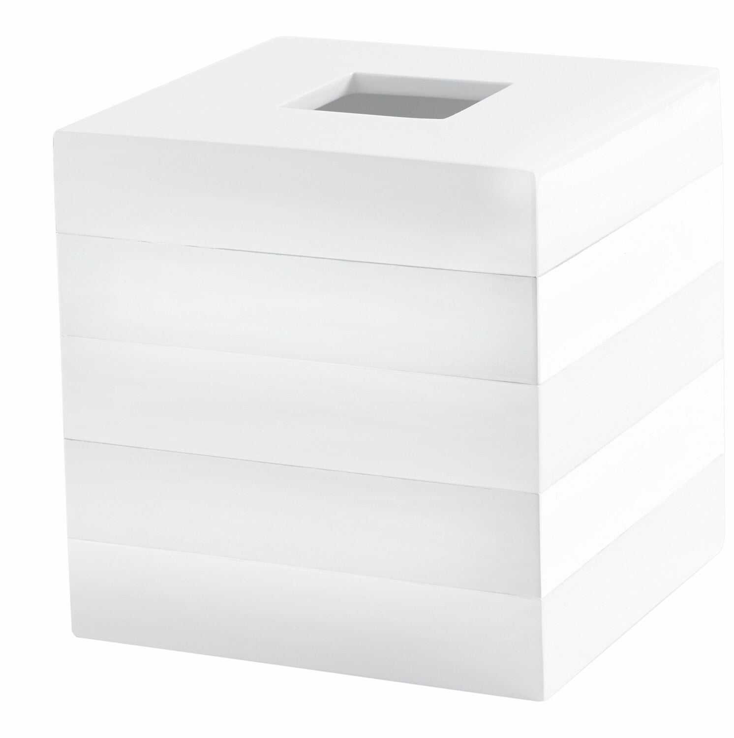 The Fine Linens Tissue Holder features a white on white stripe design that adds a modern touch to any space. Its sleek, minimalist appearance makes it a versatile addition to your decor. Crafted from 100 percent lacquer, this tissue holder is easy to clean and maintain. The clean lines and simple design make it suitable for various settings, providing both functionality and style. Perfect for those who prefer a contemporary look, this tissue holder combines practicality with a refined aesthetic. Its durable construction ensures long-lasting use, while the smooth surface allows for effortless cleaning. Enhance your space with this elegant accessory that seamlessly blends modern design with everyday convenience.