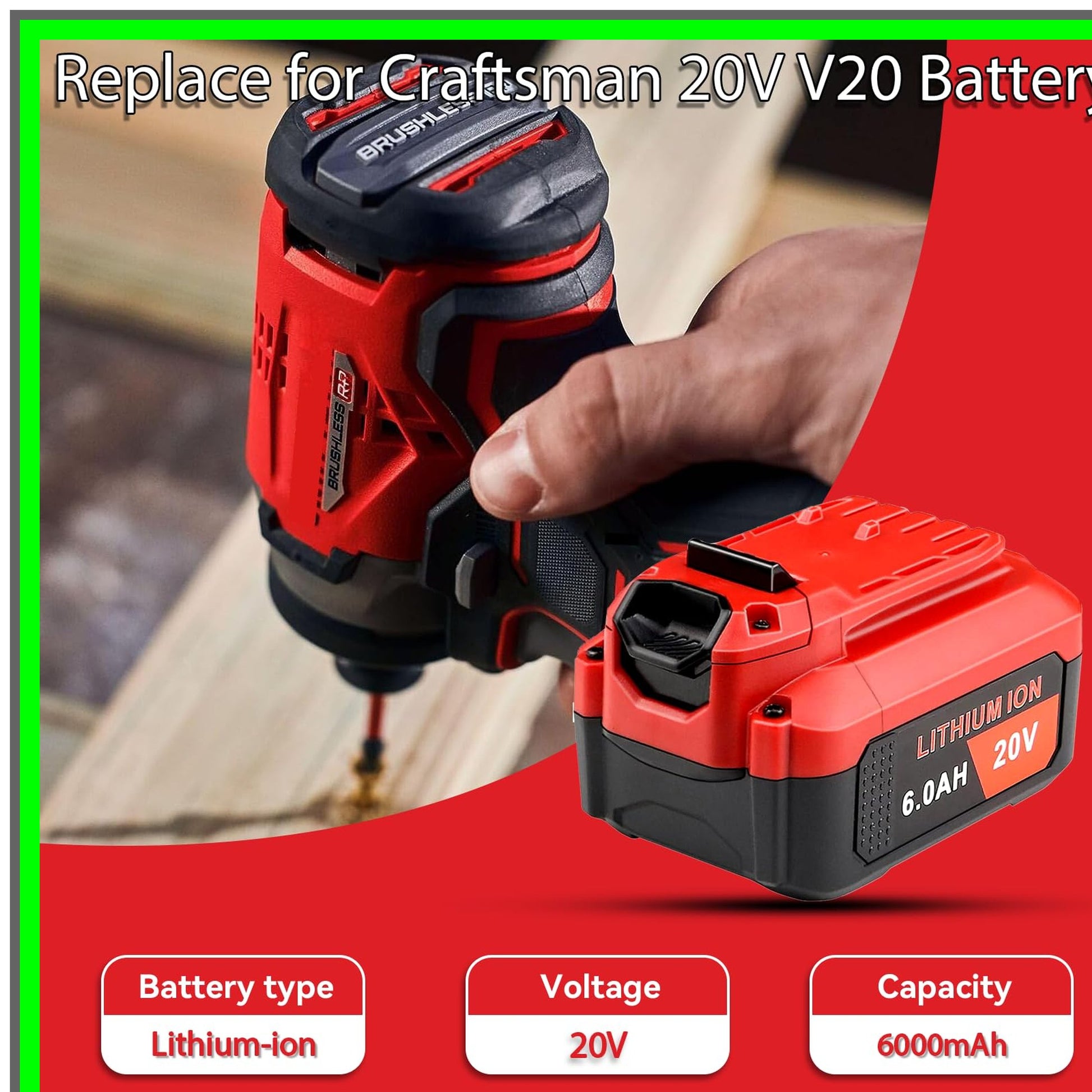 Introducing the ultimate power solution for your 20V MAX cordless tools: the high-performance 20V Lithium-Ion Battery Pack. Engineered for efficiency and longevity, this 6.0Ah battery is designed to keep your tools running at peak performance, ensuring you can tackle any project with confidence. Crafted from premium materials and subjected to rigorous testing, this battery guarantees reliability and safety, making it the perfect replacement for your existing 20V MAX V20 Series tools. Whether you're using a cordless chainsaw, impact wrench, or drill, this battery delivers consistent power and extended runtime, allowing you to complete tasks without interruption.Compatibility is key, and this battery is specifically designed to replace models such as CMCB204, CMCB202, CMCB201, CMCB205, and CMCB206. Please note that it is not compatible with the 20V MAX Bolt-On DieHard Series. To maximize battery life and performance, follow our simple care tips: allow your battery to cool down for 15-30 minutes after heavy use before charging, keep it clean and stored in a cool, dry place, and use it regularly to prevent dormancy. With a commitment to quality and customer satisfaction, we ensure that every purchase comes with the promise of exceptional service. Elevate your power tool experience with our 20V Lithium-Ion Battery Pack and enjoy the freedom of cordless convenience. For any inquiries or assistance, our dedicated support team is here to help you every step of the way. Experience the difference today!