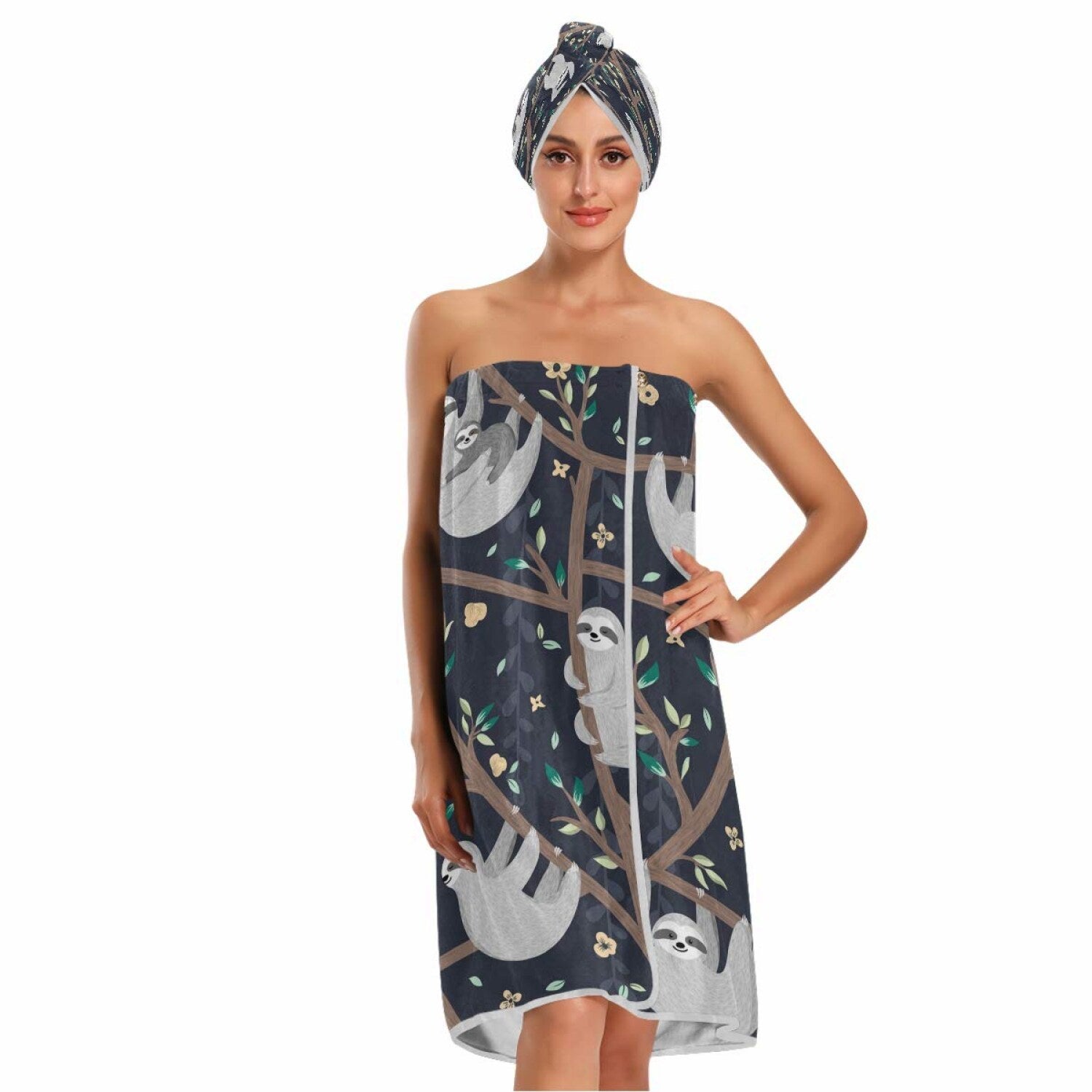 This set includes a large bath towel measuring 31.5" x 60", a dry hair cap 9.8" x 25.6", and a headband 5.9" x 8.7". The towels feature eco-friendly reactive print technology, resulting in bright, durable, and fade-resistant colors that are safe and natural. The towels are machine washable, colorfast, and easy to care for—simply wash on cool and tumble dry on low, avoiding fabric softeners and high-temperature washes above 40°C. The fiber towel has a white bottom, and after washing, it’s recommended to wring gently and smooth along the wool’s direction to maintain the pattern. The set is designed with an adjustable closure for a comfortable fit. The cute sloth design adds a charming touch, making it perfect for spa, shower, or bath use. Customer support is available within 24 hours for any questions, ensuring satisfaction with your purchase.