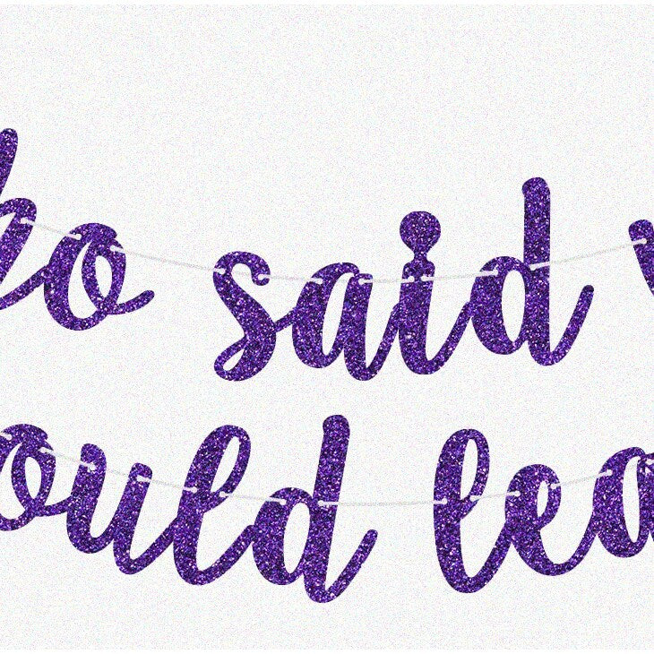 Celebrate your special farewell with this eye-catching party kit featuring a vibrant purple glitter finish. The package includes a durable, reusable cardboard banner that reads "Who Said You Could Leave," adding a fun and festive touch to any farewell, retirement, or goodbye event. Its shimmering purple color and unique design make it an ideal centerpiece to create a mesmerizing atmosphere. Easy to assemble and reuse, this kit helps set a memorable and visually stunning tone for your celebration. Whether honoring a graduate, retiree, or someone saying goodbye, this decoration elevates your gathering with elegance and charm. Make your occasion truly unforgettable with this beautiful and versatile party kit that combines durability with dazzling appeal.