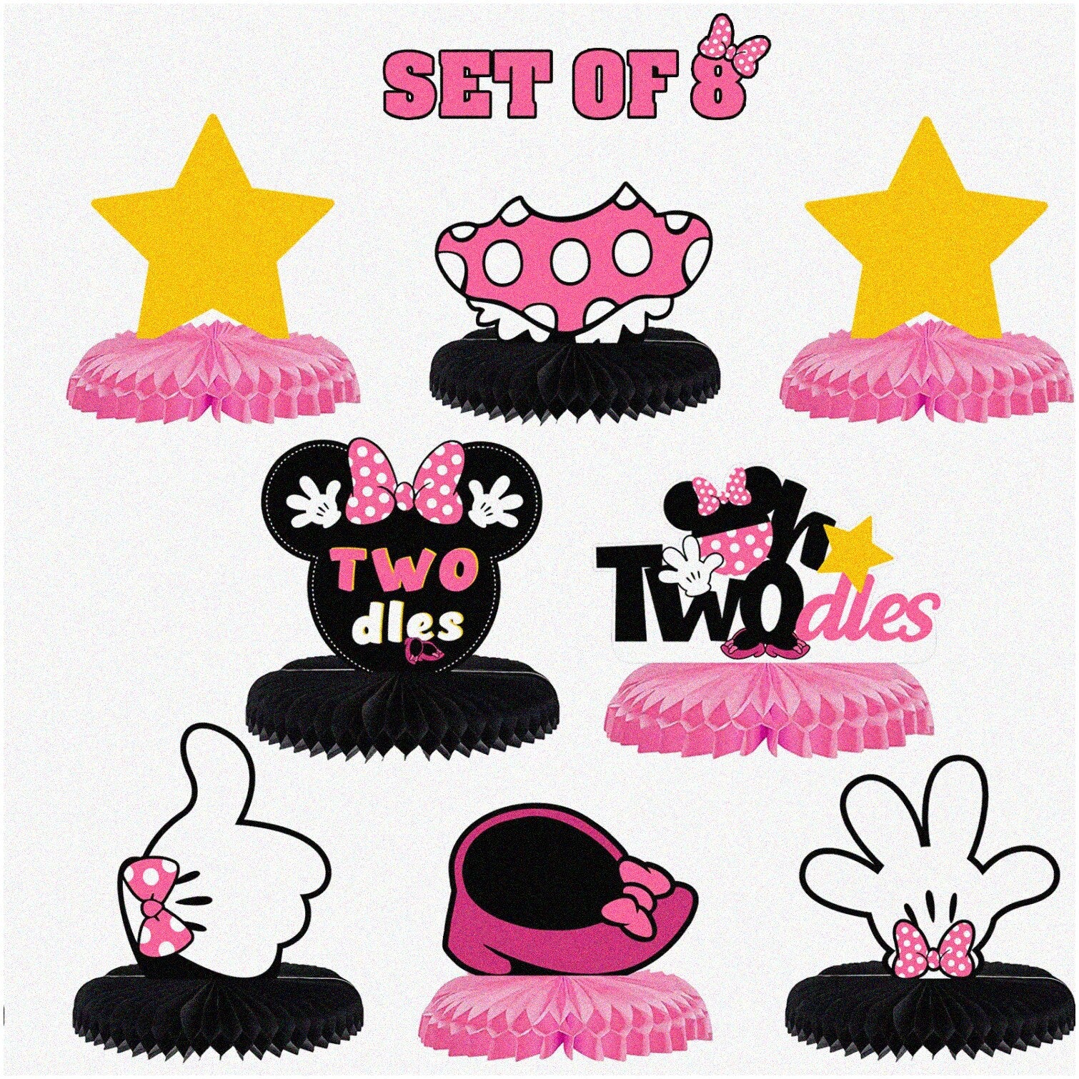 Celebrate a girl's second birthday with these charming Minnie-themed table centerpieces. This set includes eight intricately crafted honeycomb decorations that bring a whimsical touch to your party decor. Each centerpiece features Minnie's signature polka dots and bow, capturing her iconic charm and creating a magical atmosphere. Designed to elevate your birthday table, these vibrant honeycomb structures add a lively and elegant element to your celebration. Their detailed patterns and playful design make them a perfect focal point, transforming an ordinary table into a captivating display. These centerpieces are ideal for creating a joyful and memorable event, infusing your party with charm and sophistication. Perfect for a Minnie Mouse-themed birthday, they help set the scene for a delightful celebration filled with fun and enchantment.