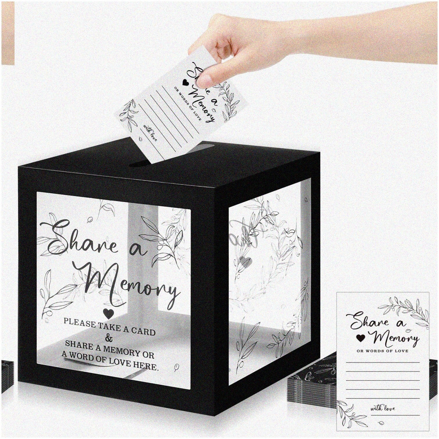 Celebrate life's special moments with this set of 50 Greenery Share a Memory Cards housed in an elegant black box. Designed to enhance any occasion, these cards provide generous space for guests to share advice, blessings, or memories, encouraging active participation and creating lasting keepsakes. Crafted from high-quality cardstock, each card measures approximately 10 x 15 cm, while the box is about 19 x 19 x 19 cm, offering a stylish and functional storage solution. The package includes one memory card box and fifty individual cards, making it ideal for gathering heartfelt messages and capturing memorable moments. Whether used as a guest book alternative or a fun photo prop, these cards add charm and meaningful interaction to your event. Perfect for funerals, graduations, weddings, bridal showers, birthdays, anniversaries, and retirements, they help commemorate and cherish life's milestones.