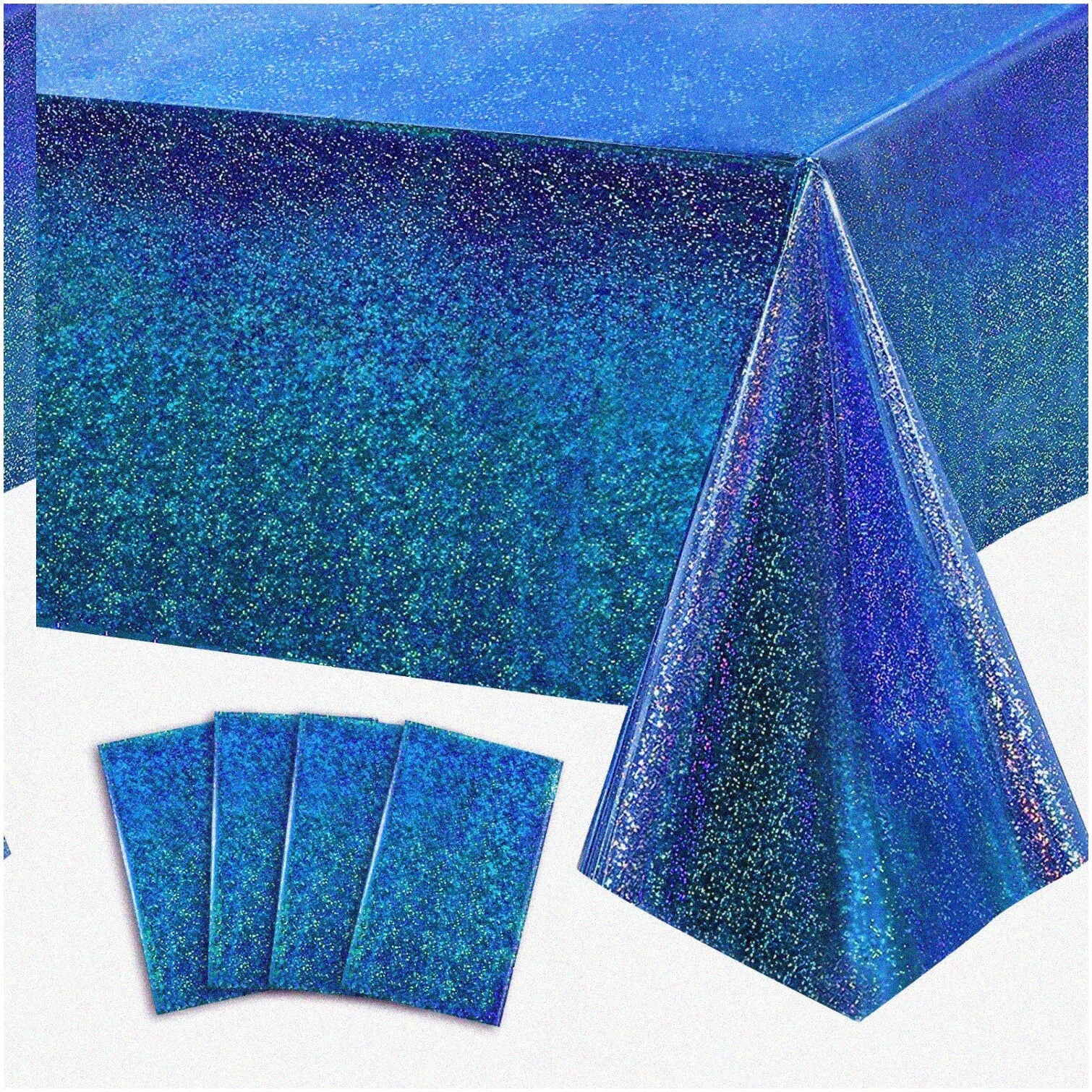 Enhance your event with this set of four blue iridescent plastic tablecloths, each measuring 54" x 108". Made from high-quality PE/Polyethylene, these shiny, disposable covers are ideal for birthdays, weddings, parties, picnics, buffets, and decorations. The smooth texture allows the tablecloths to adhere easily when lightly sprayed with water, providing a sleek, elegant appearance. Crafted from laser-like, lightweight material, they require gentle handling to ensure durability during use. Packaged in a convenient storage bag, these reusable tablecloths combine style and practicality. Designed to fit rectangular tables up to 8 feet, they add a dazzling touch to any celebration. The vibrant blue color and holographic finish create a captivating visual effect, making your event memorable. Each package includes four disposable tablecloths, offering an effortless way to elevate your decor with a shimmering, sophisticated look.