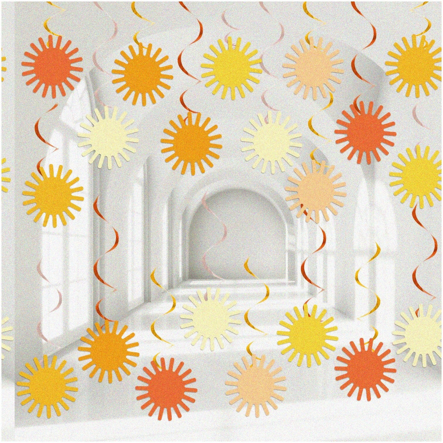 Create a charming atmosphere with this 12-piece boho sun hanging swirl set, ideal for celebrating a first birthday, baby shower, or any special occasion. The set includes 24 boho sun hanging swirls in six unique designs, 36 single-hanging swirls in three colors, and 36 plastic strings for easy hanging. Crafted from high-quality paper and premium cardstock, these decorations are durable, foldable, and safe. The whimsical sun patterns feature muted, pleasant colors that add a cozy, boho touch to any space. Each decoration is pre-strung, allowing for effortless setup on ceilings, windows, or doors using the included plastic hooks. Suitable for indoor or outdoor use, these decorations create a memorable ambiance for birthdays, baby showers, weddings, or even in bedrooms and stores. Their versatile design and high-quality materials make them perfect for various occasions, ensuring a delightful and stylish celebration.