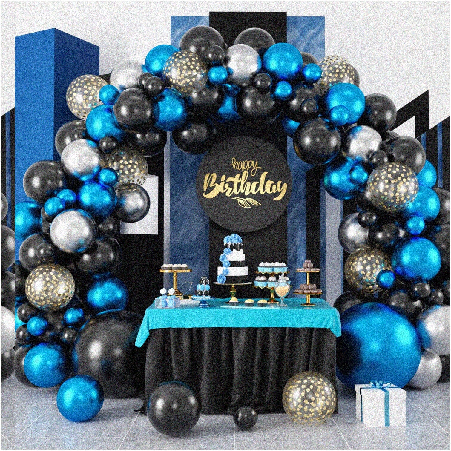 Create a stunning party atmosphere with this shimmering balloon garland kit, featuring 100 latex balloons in metallic blue, black, silver, and gold confetti designs. The set includes 15 black and 15 metallic blue balloons, along with additional silver and gold confetti balloons, perfect for birthdays, weddings, and anniversaries. Made from non-toxic latex, these balloons are durable and flexible, reducing the risk of tearing or bursting. The kit allows for easy assembly of a balloon arch or other decorative arrangements, giving you the flexibility to customize your display. Hang the balloons on walls, trees, or other surfaces to add a touch of brilliance to your celebration. Whether used as a backdrop or a centerpiece, these balloons will elevate your event decor and create memorable moments. The vibrant metallic finishes and confetti accents make this set ideal for adding a festive and elegant touch to any special occasion. Features include metallic blue and silver balloons, with 15 black and 15 metallic blue balloons measuring 5 inches.