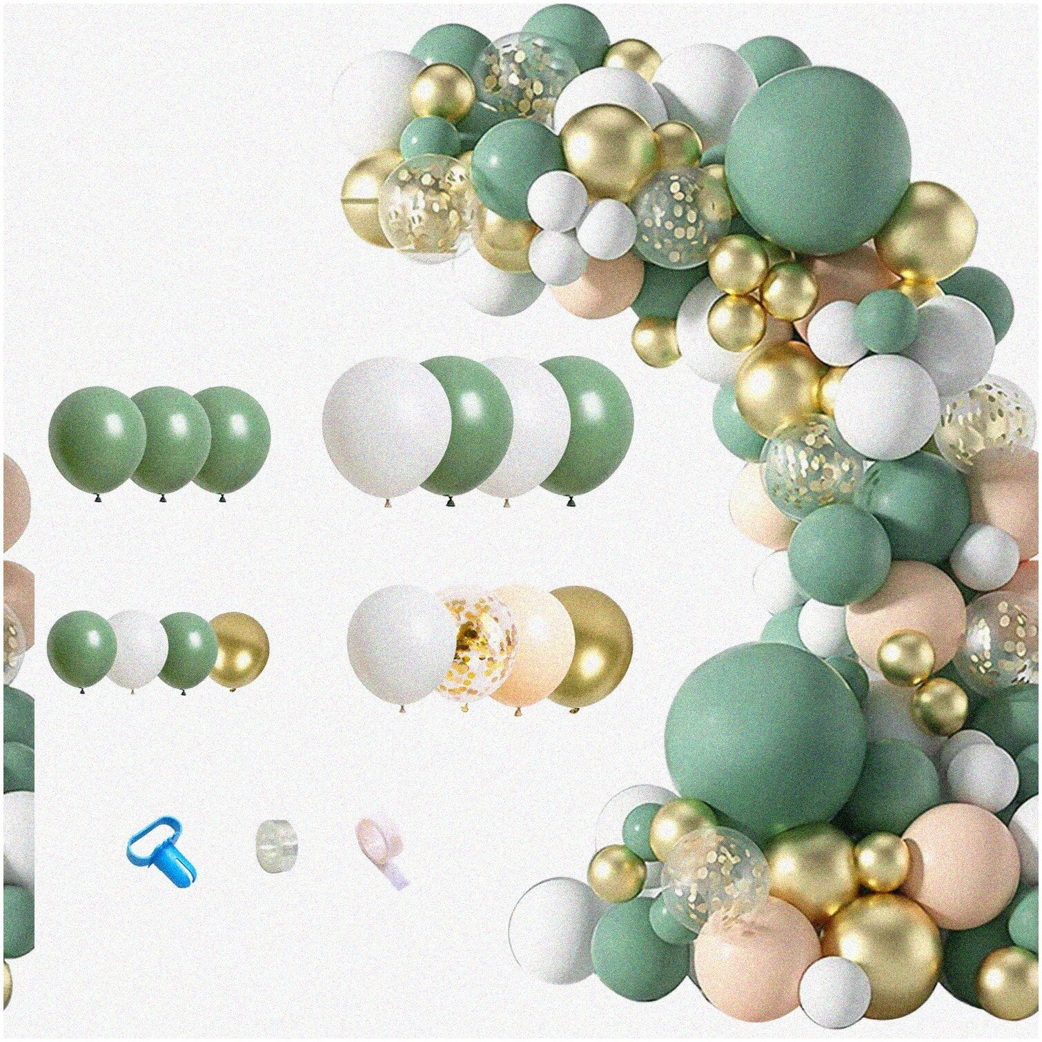 This balloon arch kit includes a variety of balloons in avocado green, white, nude, and metallic gold, along with golden confetti balloons. The set features 2 large 18-inch avocado green balloons, 2 white balloons of the same size, and numerous smaller balloons in different sizes and colors, including 10-inch, 12-inch, and 5-inch options. The collection offers a mix of solid, metallic, and confetti-filled balloons, perfect for creating a vibrant and elegant decoration. The kit also includes essential tools: a 16-foot arch strip tape for shaping the arch, a balloon tying tool for quick and secure tying, and 100 adhesive dots for attaching balloons to surfaces or creating full, professional-looking arrangements. All balloons are carefully packed to prevent damage during transportation, making this set ideal for decorating weddings, birthdays, baby showers, or bridal parties with a touch of sophistication and fun.