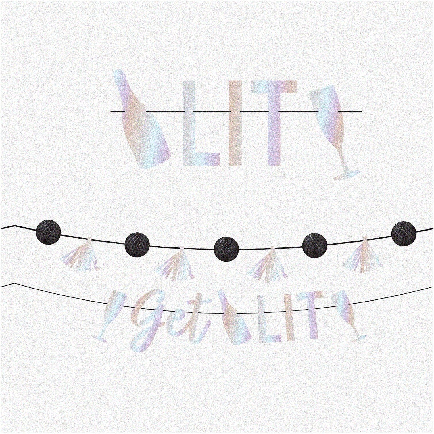 Enhance your celebration with this versatile banner kit, perfect for adding a vibrant touch to any event. The kit includes an iridescent letter banner measuring 6 feet long, featuring shimmering hues and a delicate ribbon for easy hanging. Complementing this is a honeycomb and iridescent tel banner, measuring approximately 5 4/5 inches by 4 1/2 inches, showcasing a charming combination of honeycomb balls and iridescent tels, tied together with an elegant ribbon. The set contains two paper banners, crafted for durability and lightweight handling, making setup simple and hassle-free. Additionally, a striking banner features black honeycomb balls and iridescent tels with a playful "Get Lit" headline, creating a lively focal point. Designed to transform any space into a magical celebration, this colorful décor set injects excitement and sophistication into your party atmosphere, ensuring a memorable experience for all guests.