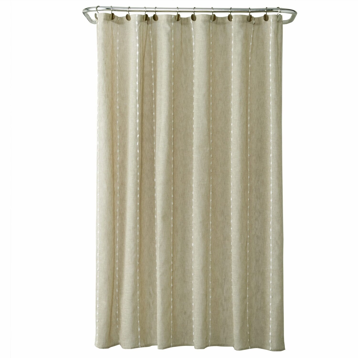 The Davidson Stripe Shower Curtain features a natural sheer linen fabric accented with woven vertical white decorative thread stripes and intermittent fuzzy tufts, adding subtle texture and visual interest. Designed with twelve eyelet holes at the top for easy hanging, it measures 70" x 72". The curtain is made from 100% polyester, offering a watercolor look print on a textured weave linen fabric. It is easy to care for, being machine washable and dryable. Shower hooks and liners are sold separately. This elegant yet simple design brings a touch of rustic modern charm to your bathroom decor. Its versatile style complements a variety of interior aesthetics, from modern to cozy. With over 40 years of experience and a focus on premium fabrics and global design inspiration, this shower curtain adds personality, fun, and flair to your most intimate spaces. Imported.