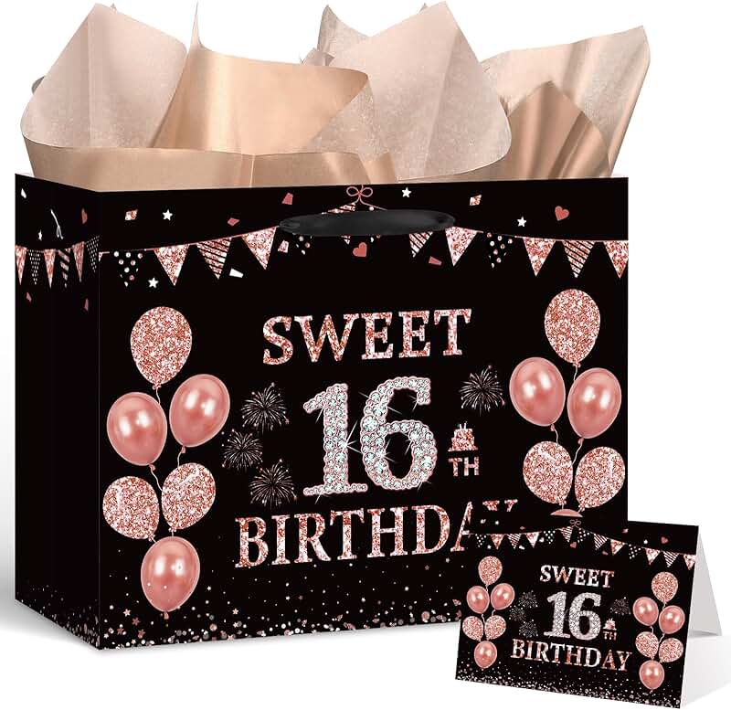 This black and rose gold gift bag is designed for a 16th birthday celebration. It includes a greeting card and tissue paper, making it suitable for wrapping gifts for girls turning 16. The bag is ideal for birthday or holiday parties, providing a stylish way to present gifts. Its elegant design adds a special touch to any celebration, making it a thoughtful choice for marking this milestone.