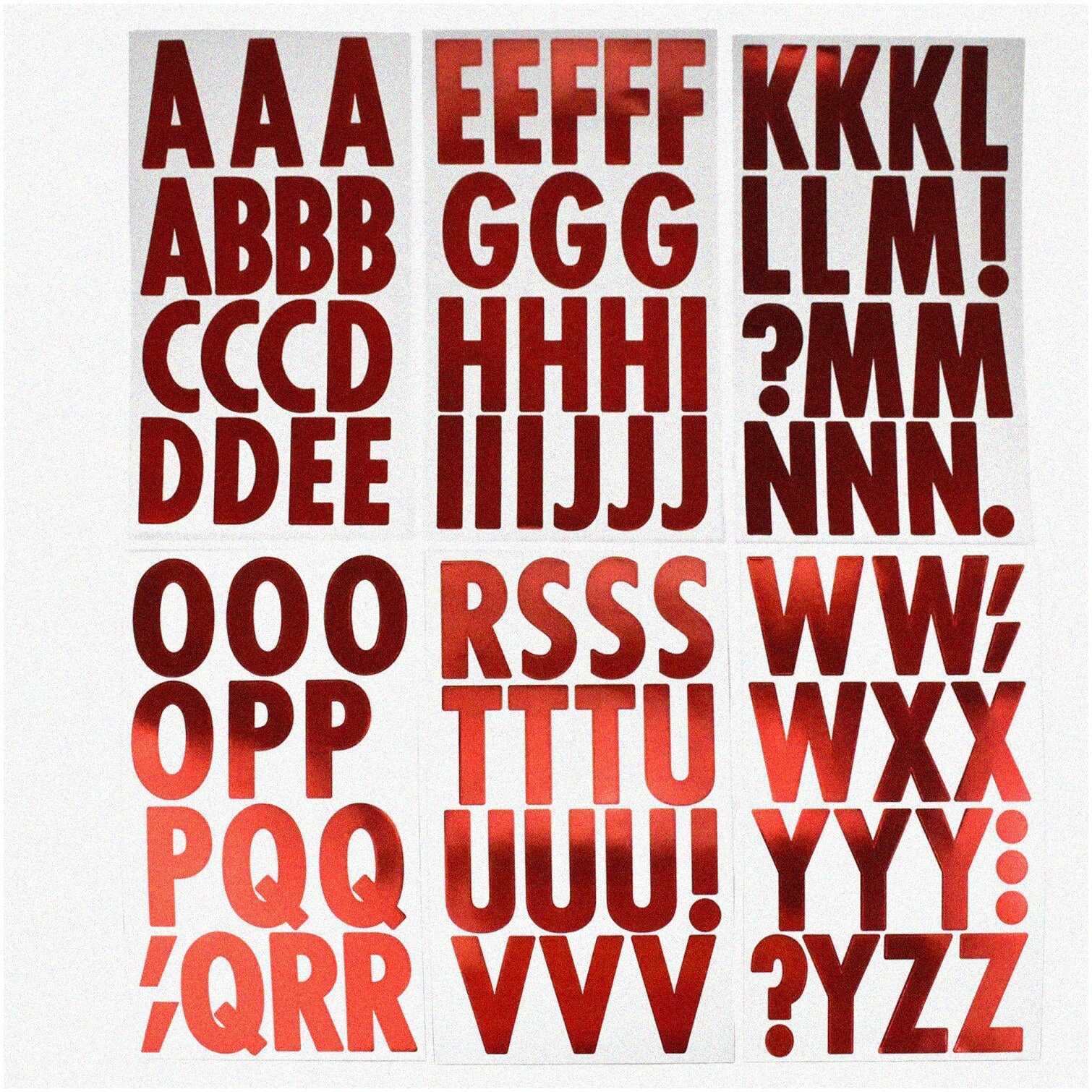 Metallic Red Big Font Alphabet Letter Stickers feature bold, 3-inch uppercase letters crafted from high-quality vinyl. Each pack includes 26 stickers, one for each letter of the alphabet, spread across 4 sheets with 6 or 7 letters each. The vibrant metallic red color adds a touch of glamour and sophistication, making these stickers ideal for a variety of projects. Perfect for personalizing gifts, decorating scrapbooks, or enhancing craft projects, these versatile stickers are designed to make a bold statement. Their large size ensures they stand out and catch attention, while the uppercase caps design provides a clear and impactful look. Whether for school assignments, party decor, or creative displays, these stickers offer a stylish and practical solution. Unleash your creativity and add a pop of color and style to your projects with these eye-catching metallic red alphabet stickers.