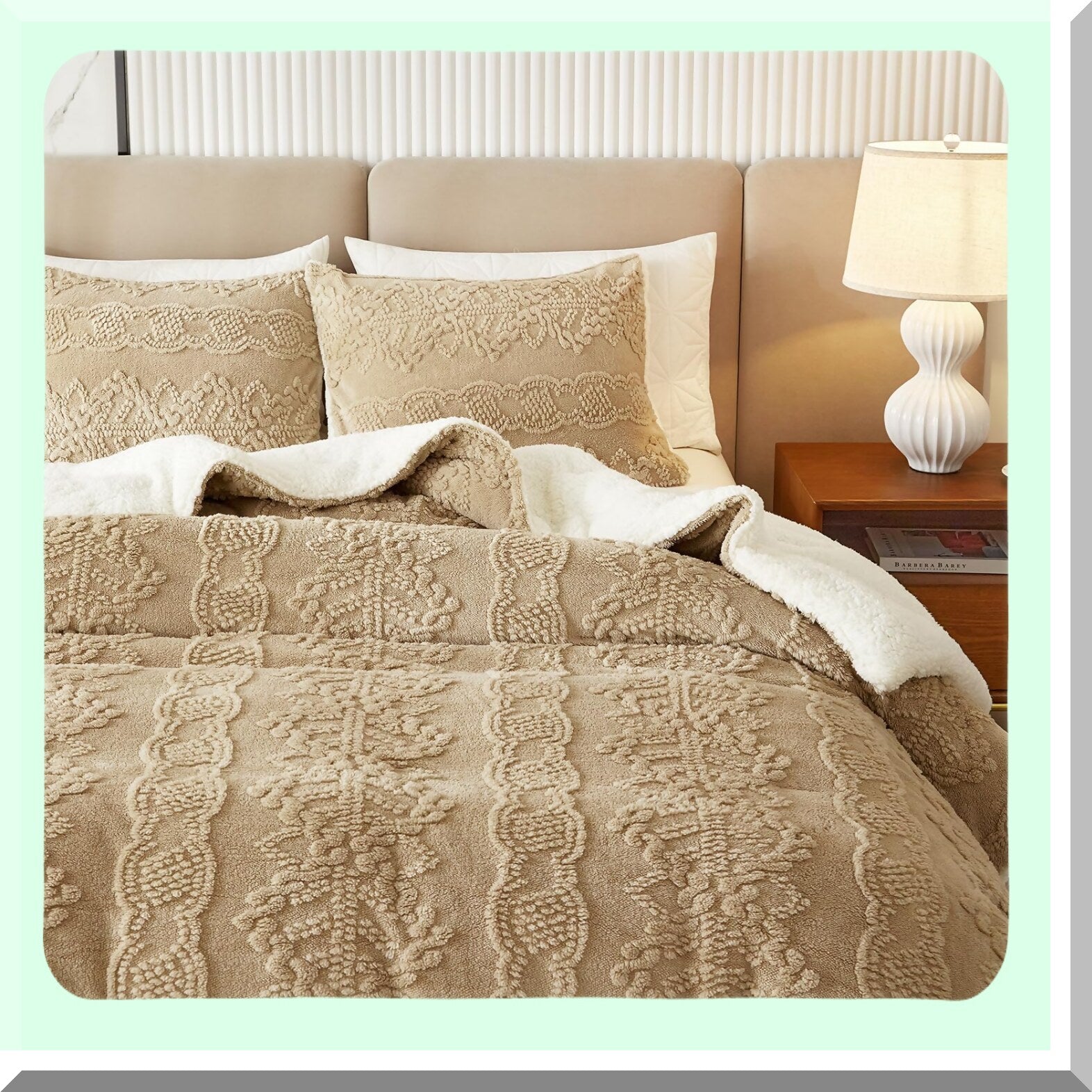 WinterLux Flannel Fleece Sherpa Comforter Set - Boho Jacquard Stripes, Ultra Soft & Warm Bedding Set, Luxury Down Alternative Comforter, Khaki - 3 Piece