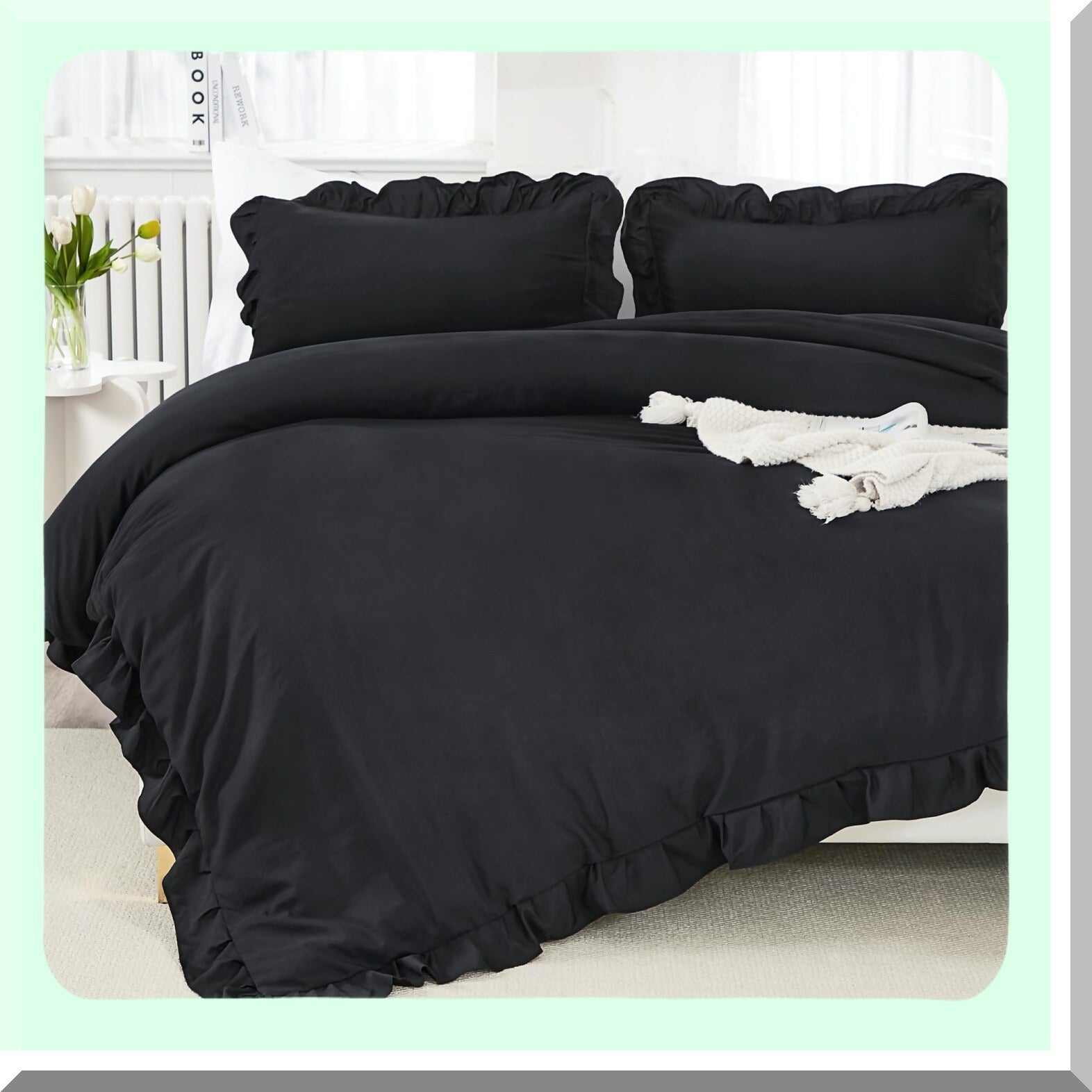 Ruffle Black Farmhouse Comforter Set - Soft Lightweight Fluffy Bedding Set - All Season Microfiber Bed Set - 3 Piece Aesthetic Bed Set - 104x90In Comforter - 2 Pillowcases