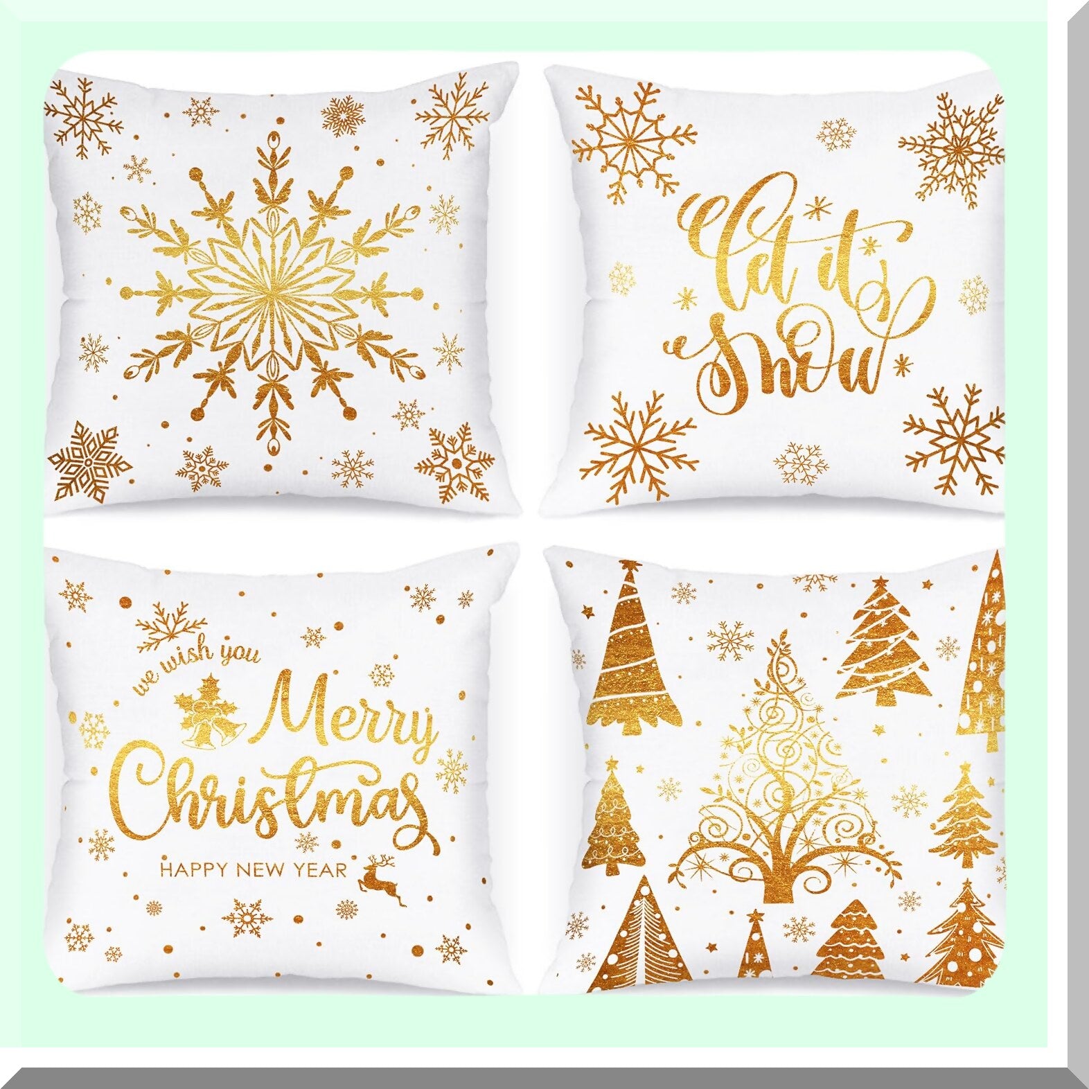 Luxury Gold Accent Holiday Pillow Covers - Set of 4 | White & Gold 18x18 Decorative Cushion Cases for Xmas Home Decor - Bedroom & Living Room Couch Accessories