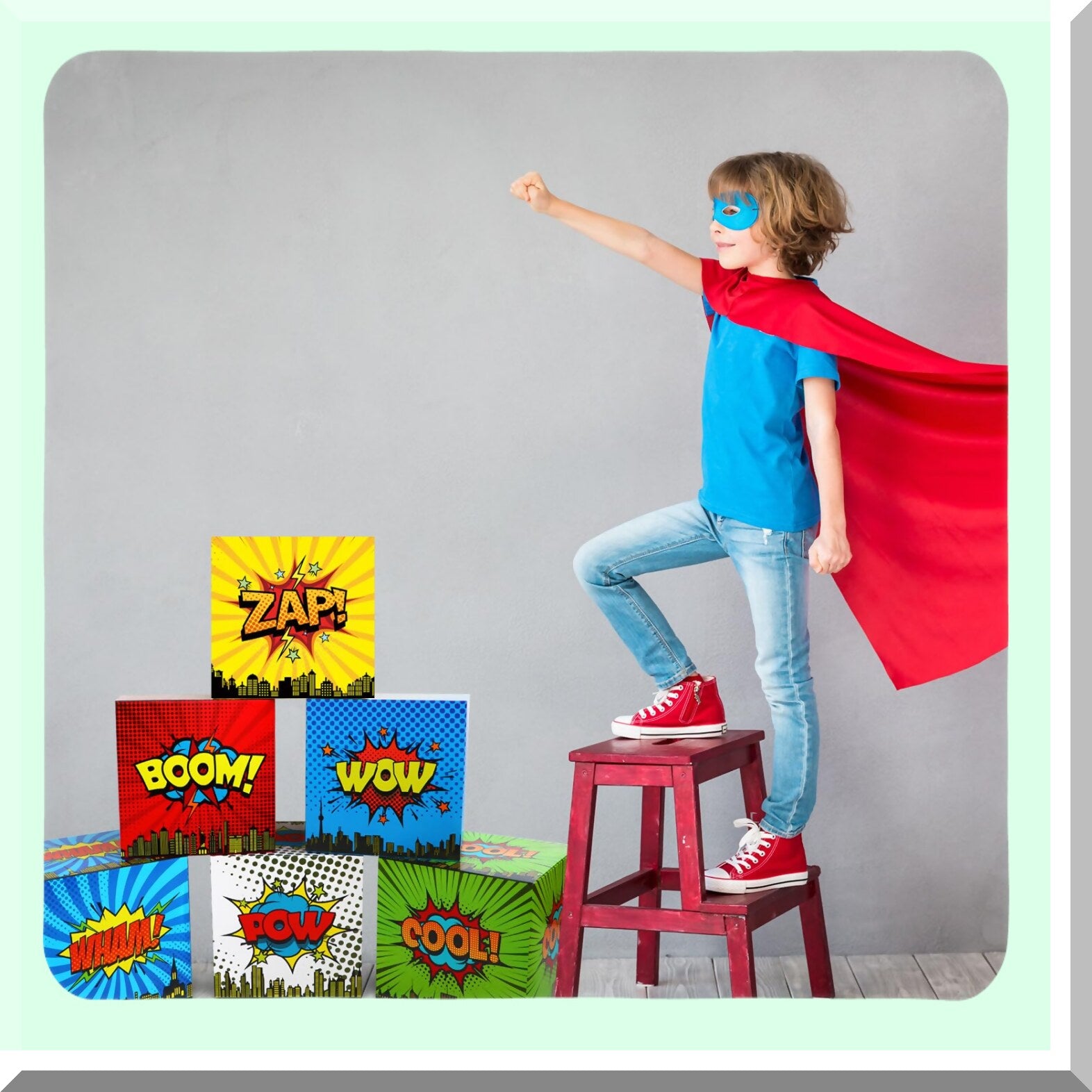 Set of six large hero-themed cardboard boxes measuring approximately 12 x 12 x 12 inches, ideal for decorating hero-themed parties and creating an exciting atmosphere. These easy-to-assemble boxes are pre-folded and can be quickly set up or taken down, making them convenient for various event setups. Made from durable 350g cardboard, they are non-toxic and feature vibrant printed designs with hero elements that add a festive touch and enhance visual appeal. Suitable for a wide range of occasions including birthdays, themed parties, family gatherings, celebrations, and holidays, these boxes serve as attractive decorations and thoughtful gifts for friends, teachers, coworkers, and neighbors. Their sturdy construction ensures reusability across multiple events. Perfect for creating memorable moments, these hero-themed decor props help set the scene and engage guests with their eye-catching design and versatile use.