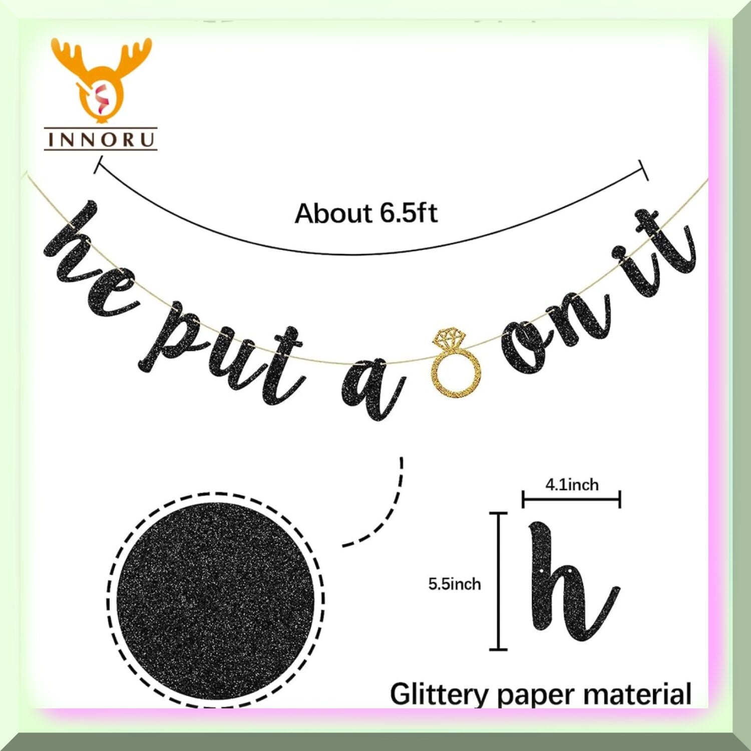Celebrate your special moments with this glittering "Ring On It" celebration banner, perfect for engagement parties, bridal showers, and bachelorette events. Featuring dazzling black glitter letters and a stunning gold ring pattern, this banner creates a captivating backdrop that adds elegance and charm to any occasion. Easy to assemble with separate ribbons and cards, it takes just two minutes to set up. Its aesthetic design exudes sophistication, making it a beautiful centerpiece for photos and celebrations alike. The versatile style seamlessly transitions from engagement shoots to bridal showers, enhancing the atmosphere with intricate details and delicate craftsmanship. Whether capturing playful, heartfelt, or glamorous moments, this banner elevates the event, creating memorable experiences filled with joy and laughter. Its vibrant and lively appearance encourages fun and spontaneous photos, making every celebration truly enchanting. Add this exquisite piece to your event decor and cherish the timeless memories it helps create.
