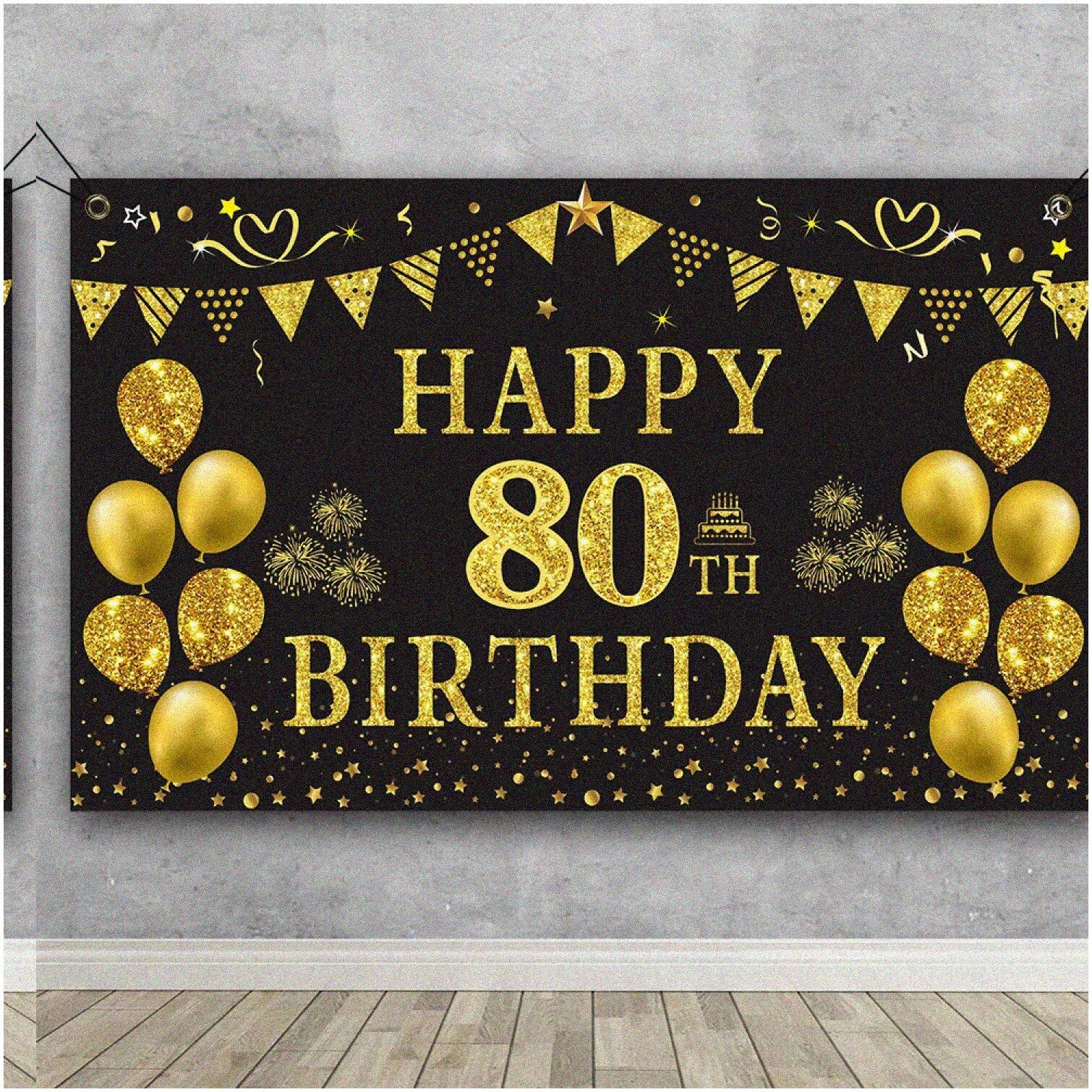 Celebrate a special milestone with this elegant black and gold 80th birthday backdrop. Measuring 5.9 by 3.6 feet, it provides a striking focal point for any celebration. Crafted from high-quality, durable materials, this banner is suitable for both indoor and outdoor use, ensuring it remains vibrant throughout the event. The digitally printed design features a sophisticated pattern with bold colors and stylish typography, adding a touch of class to your decor. Please note that due to printing processes, there may be slight color variations and creases upon arrival, which can be smoothed out with low heat ironing or by rolling the banner for a few days. The backdrop is easy to hang using the provided rope, or with clips, tape, or pushpins. Its impressive size and eye-catching design make it ideal for creating memorable photos and celebrating this significant milestone in style.