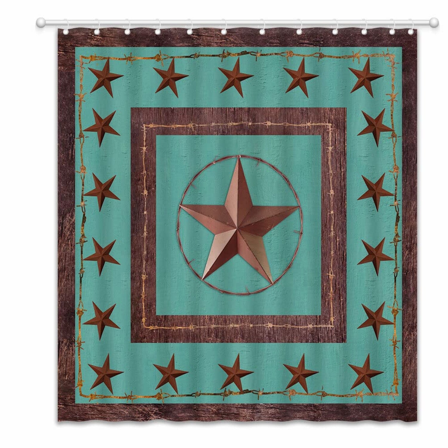 This shower curtain features a Western Texas star design with rustic wooden barn door accents in teal and brown tones, adding a country farmhouse charm to your bathroom decor. Made from durable polyester fabric, it drapes elegantly from top to bottom, providing a full and refined appearance. The curtain is both stylish and practical, offering privacy while enhancing the overall aesthetic of your bathroom. It is easy to hang and compatible with straight or curved shower rods, as well as S-shaped hooks, shower rings, and other bathroom hooks. The package includes one shower curtain and hooks, making installation straightforward. Please note that manual measurement may result in a 1-2cm difference, and color variations may occur due to monitor differences. This curtain is an ideal choice for creating a cozy, rustic atmosphere in your bathroom space.