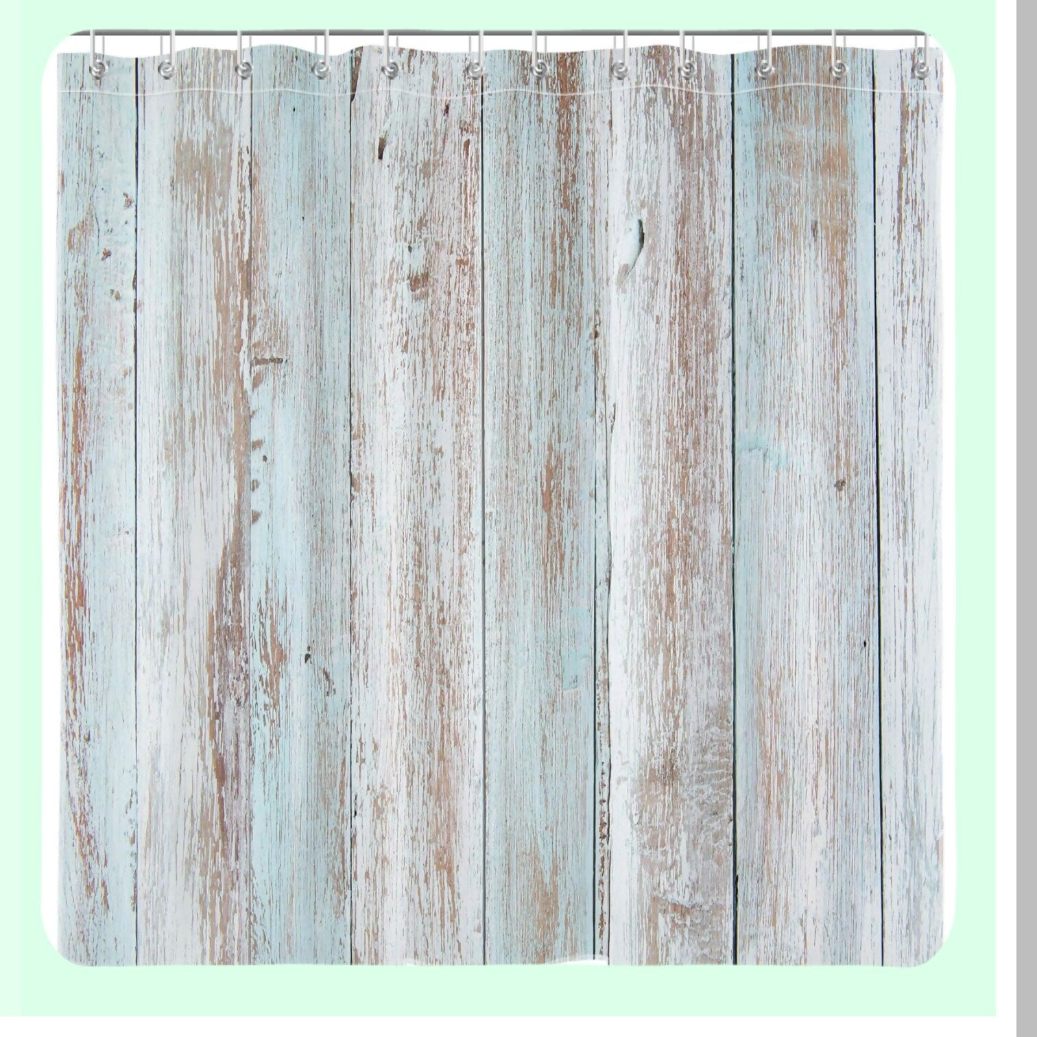 This vintage wood barn shower curtain features a design inspired by old teal and grey vertical wooden planks, creating a rustic farmhouse aesthetic. Made from hotel-quality polyester fabric, it is waterproof, durable, and super soft, ensuring a pleasant bath experience. The HD digital printing technology provides clear, vibrant images that do not fade over time, with environmentally friendly ink that is odorless and safe. The standard size of 72x72 inches fits most bathrooms and can be used with or without a liner for added privacy and splash protection. The curtain includes 12 rust-resistant hooks for easy installation, allowing you to quickly transform your bathroom decor. It is easy to care forβhand or machine wash in cold water, avoid bleach, and do not tumble dry or iron at high temperatures. Custom sizes and colors are available through a professional design team. Please note slight color and size variations may occur.