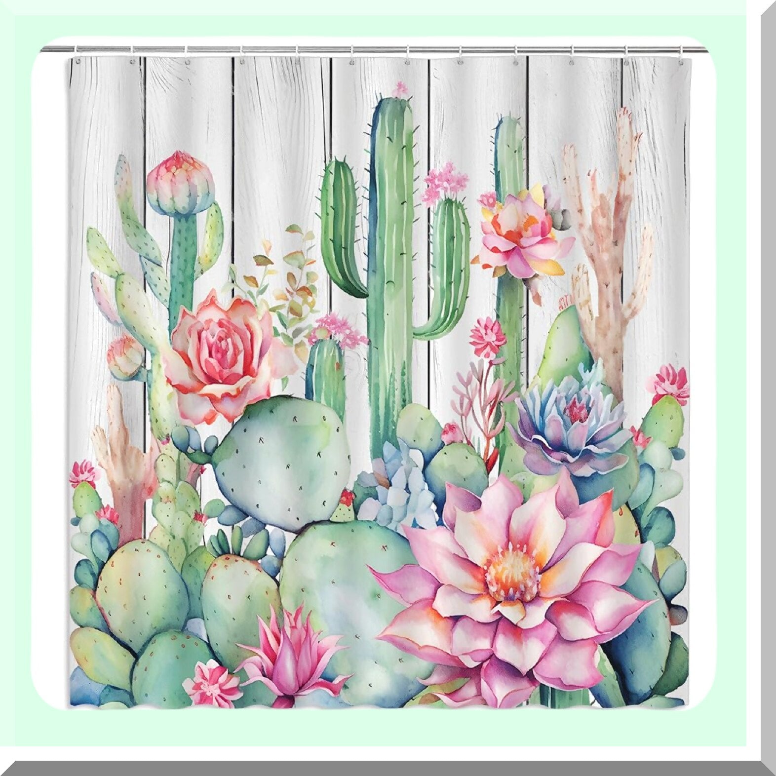 This bathroom shower curtain is crafted from durable textured polyester fabric, offering anti-tear and anti-wrinkle features for long-lasting use. The design showcases modern, unique artwork of cacti, desert succulents, tropical flowers, green plants, and wooden boards, printed in high definition with vivid, bright, and bold colors. Measuring 70 x 70 inches, it provides excellent privacy and enhances the bathroom ambiance. The curtain is easy to care for, being machine washable in cold water, and can be ironed at low heat if needed. It is suitable for use in any bathroom setting, adding a touch of nature-inspired decor. The product includes hooks for easy installation. Customer satisfaction is a priority, and support is available for any questions or concerns. This versatile shower curtain combines functionality with attractive design, making it a stylish addition to your bathroom decor.