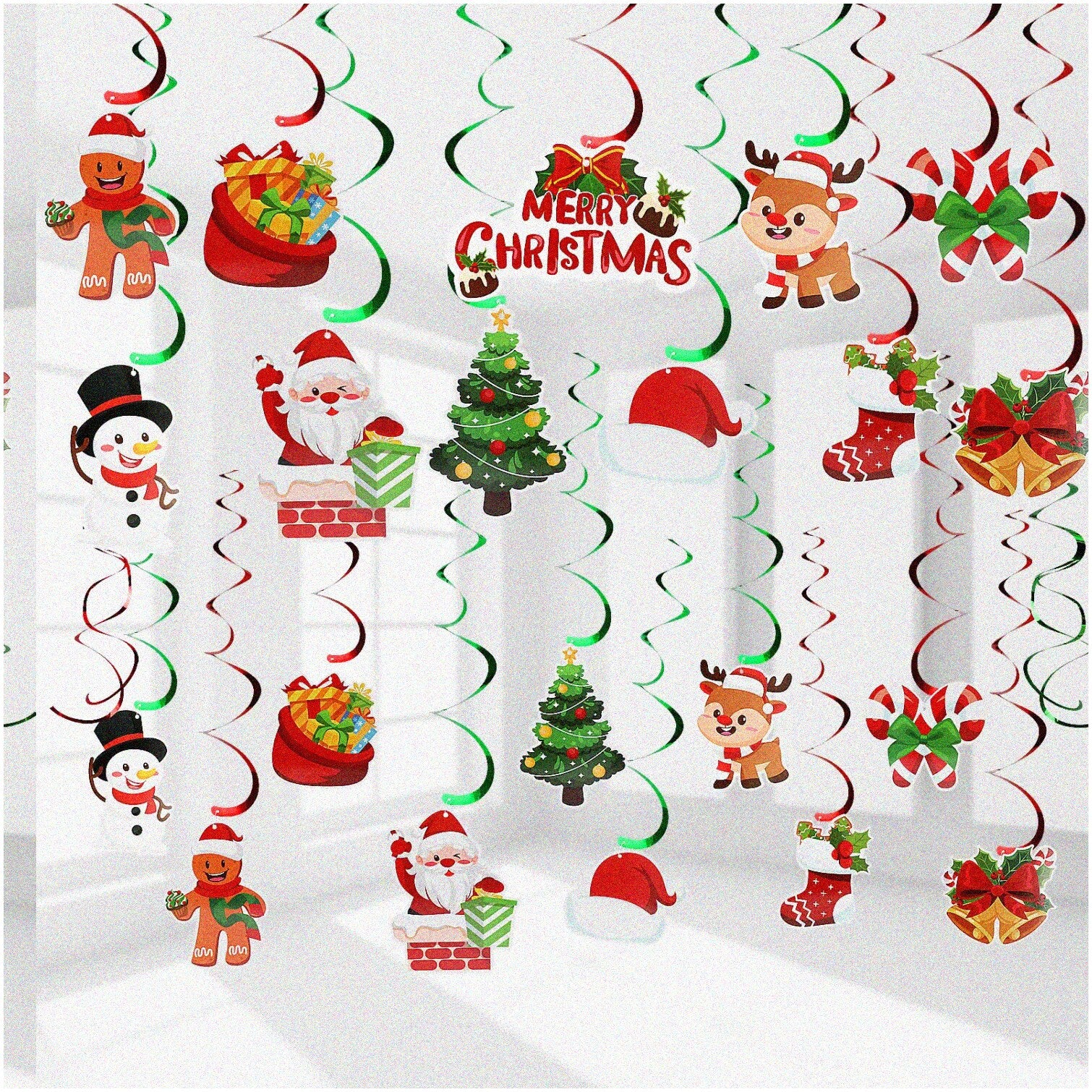 Add a festive touch to your holiday celebrations with this set of 30 hanging swirl decorations. Featuring charming snowmen and majestic elks, these decorations are designed to enhance any indoor or outdoor space. The package includes one "Merry" pattern swirl with cutout cards, twenty Christmas-themed swirls with cutouts, and nine double swirls in red and green colors without cutouts. Perfect for decorating ceilings, walls, or outdoor areas, these versatile decorations bring a magical winter atmosphere to your event. Their vibrant designs and varied styles make them ideal for creating a cheerful holiday environment. Easy to hang and suitable for both indoor and outdoor use, these decorations are a simple way to elevate your holiday decor. Whether for a Christmas party or seasonal gathering, this set helps create a memorable and festive ambiance for all your holiday festivities.
