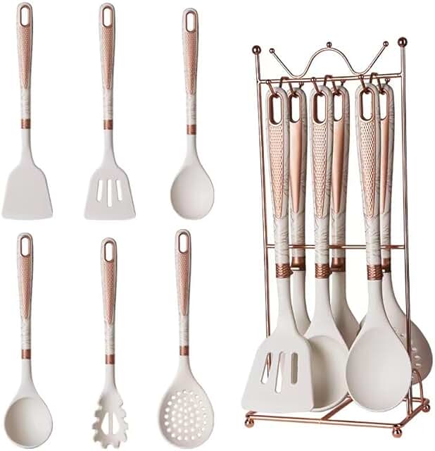 This set includes seven kitchen utensils made from silicone with easy-to-clean handles. The utensils are designed for various cooking tasks and feature a copper-coated stainless steel storage rack for organization. The large tools are durable and practical for everyday use.