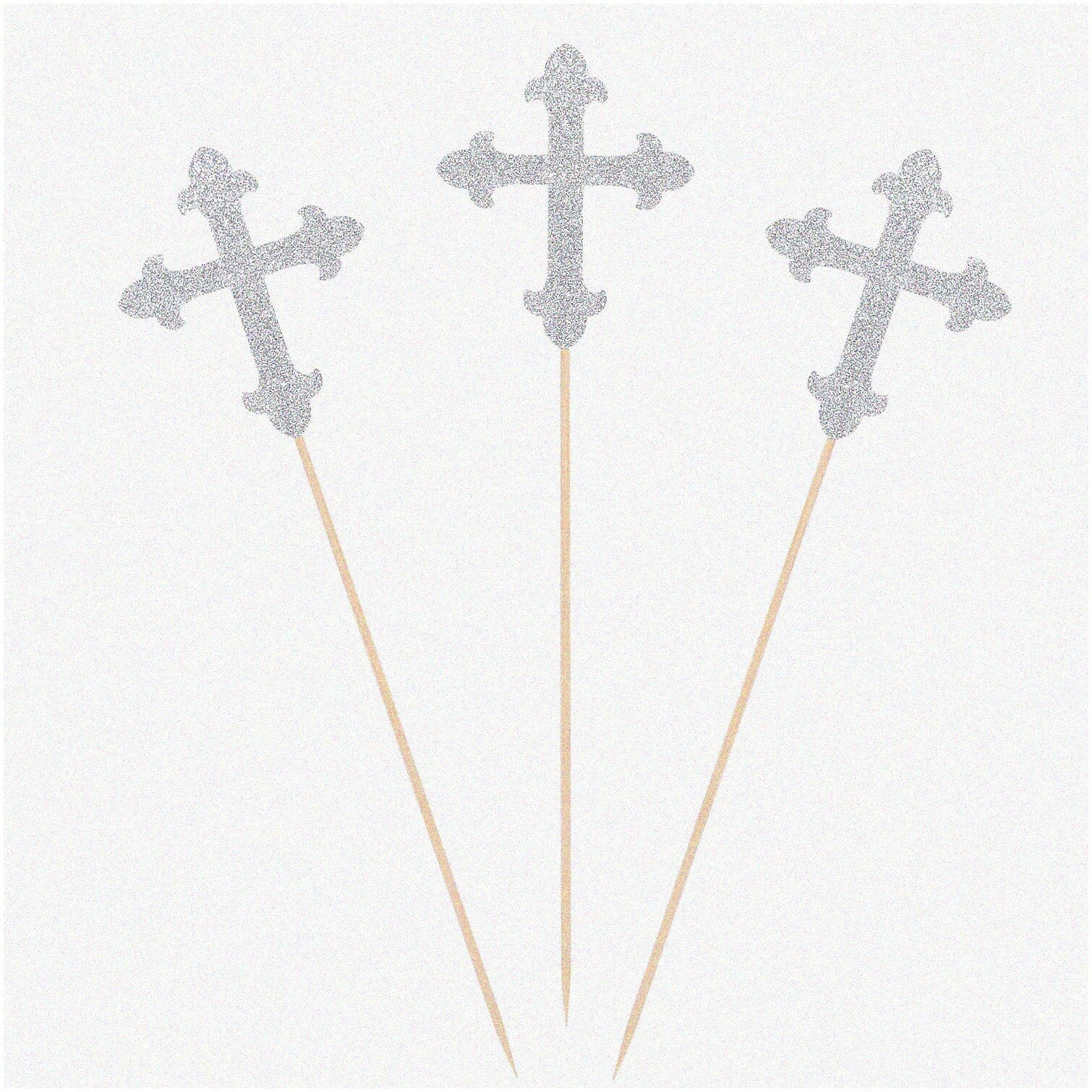 Sparkling Faithful Moments Cross Decor Sticks are charming, single-sided toppers with a plain white back, designed to add a touch of elegance to religious celebrations. Crafted with meticulous detail, these glittery silver decorations feature intricate patterns that evoke a sense of spiritual serenity. Their versatile design makes them suitable for various occasions, including baptisms, christenings, baby showers, and weddings, providing a timeless and sophisticated accent. Each piece showcases impeccable craftsmanship, ensuring a flawless finish that highlights artistry and attention to detail. The symbolic elements embedded in the design reflect cherished Christian traditions, allowing you to infuse your event with meaningful spiritual significance. These decorative sticks serve as beautiful centerpieces or accents, creating an ethereal ambiance and leaving a lasting impression on guests. Perfect for adding a divine touch to your celebration, they combine elegance, craftsmanship, and symbolic meaning in one exquisite package.