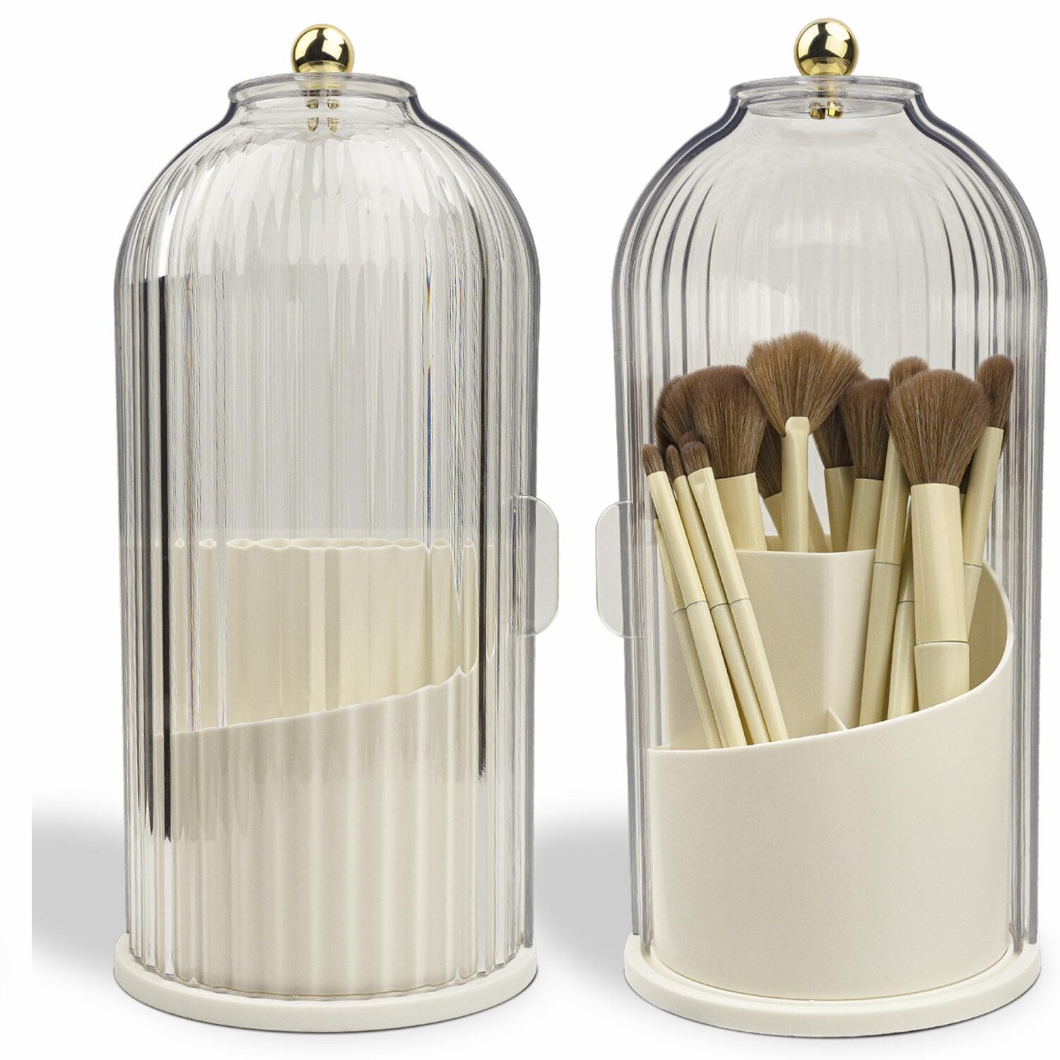 The makeup brush holder organizer features a clear lid and a 360-degree rotating sliding opening, making it easy to access your cosmetics. Designed to hold a variety of items such as makeup brushes, eyebrow pencils, eyeliners, nail polish, nail brushes, mascara, and lipsticks, it helps keep your space tidy and organized. The container is waterproof and dustproof, providing protection for your cosmetics and tools. Its compact design is suitable for use on bathroom counters, bedrooms, or dressers, helping to save counter space. The transparent cover allows you to see the contents easily while keeping your items away from air and dust. The rotating sliding opening ensures convenient access to your makeup essentials, making it a practical addition to your vanity or storage area. Durable and functional, this organizer helps maintain a clean and organized environment for your beauty products.