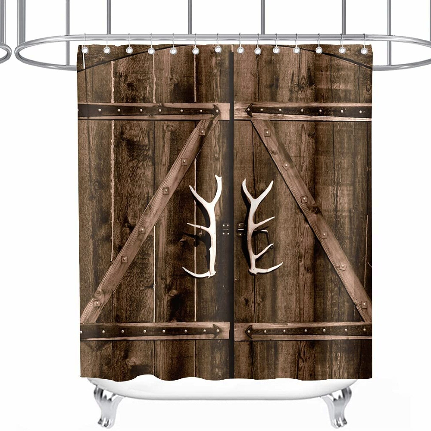 This shower curtain measures 72 inches by 72 inches and features a rustic deer horn and wooden plank design suitable for kids' bathrooms. Made from 100% polyester, it offers waterproof protection and is washable for easy maintenance. The curtain includes 12 plastic hooks for simple installation. Its hotel-quality cloth is quick-drying, eco-friendly, and easy to clean—simply machine wash on a gentle cycle with mild detergent, avoiding bleach. Designed to keep your family’s privacy secure, the curtain provides a safe and comfortable bathing environment. The waterproof front surface allows for quick cleaning, while the durable fabric ensures long-lasting use. If any issues arise upon receipt, customer support is available to assist. This product combines practicality with a charming rustic aesthetic, making it a functional addition to any kids' bathroom.