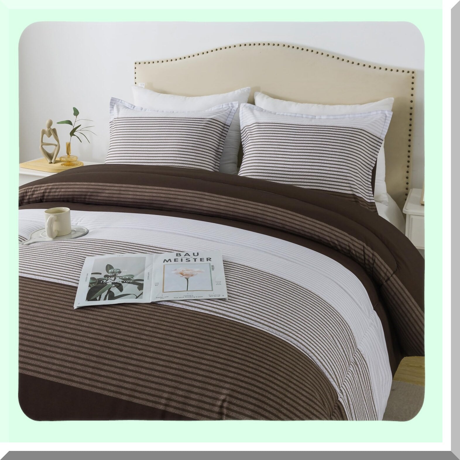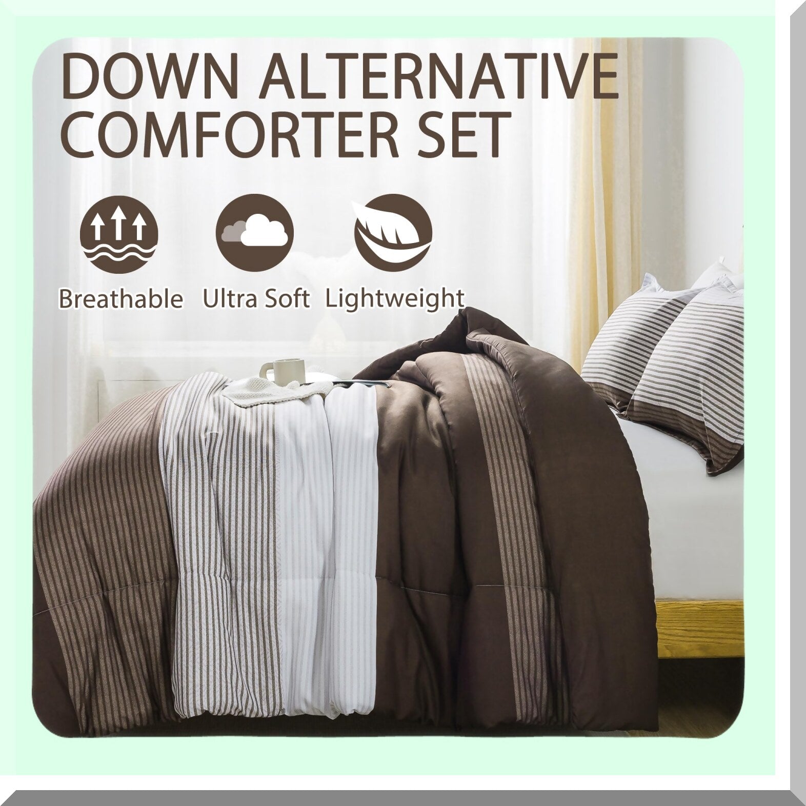 Brown Stripe Patchwork Comforter Set - Queen Size (90x90 Inch) - 3 Piece Soft Microfiber Down Alternative Bedding with Corner Loops - Cozy Bedroom Decor