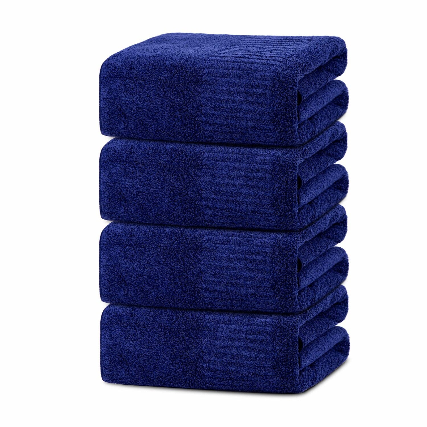 This set includes four large bath towels measuring 35 x 63 inches, designed to provide a luxurious and comfortable experience. Crafted from a premium blend of 70% polyester and 30% viscose made from bamboo, these towels are ultra soft, thick (350 GSM), and highly absorbent, quickly drying moisture to keep you dry and comfortable. The towels feature a double-stitched hem for durability and maintain their softness after multiple washes. Their oversized design makes them suitable for various uses, including bathing, swimming, yoga, and outdoor activities. The lightweight construction ensures quick drying and easy handling, while the stylish navy blue color adds a touch of elegance. Care instructions recommend washing with cold water to remove excess lint, air drying for maximum softness, and tumble drying on low heat. These versatile towels are ideal for home, gym, hotel, sauna, or outdoor use, offering long-lasting quality and comfort.