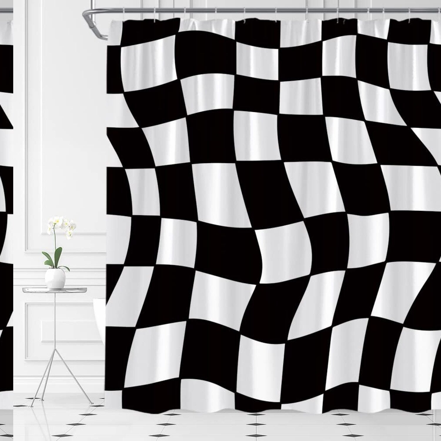 This shower curtain measures 70 x 70 inches (180 x 180 cm) and features a black and white checkered design with a retro, funky, groovy aesthetic reminiscent of the 60s and 70s. Made from fabric, it offers a stylish addition to any bathroom decor. The set includes 12 easy-to-install hooks, making setup simple. Crafted with independent design and production capabilities, the product emphasizes quality and unique style to enhance your shopping experience. Please note that manual measurement may result in a 1-2 cm discrepancy, and colors may vary slightly due to monitor differences. It can be used as a standalone curtain or paired with an existing shower liner. Perfect for adding a bold, abstract checkerboard pattern to your bathroom, this curtain combines functionality with a distinctive vintage-inspired look.