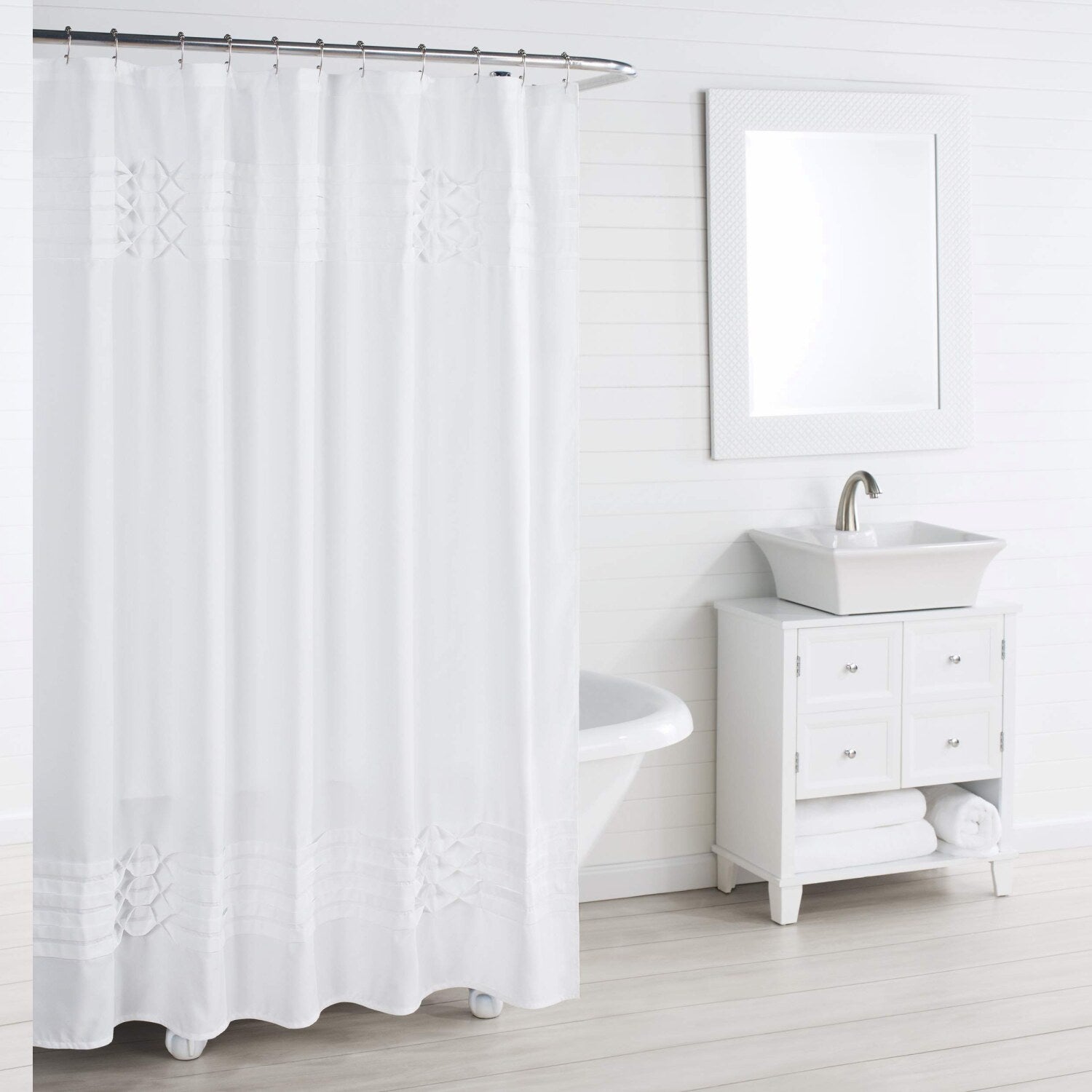 This shower curtain measures 72" x 72" and features a triple diamond pattern on a white background. Made from 100% polyester, it adds a crisp and clean feel to your bathroom decor. The design showcases dimensional diamonds that provide subtle textural interest, enhancing the overall aesthetic of your space. It includes one shower curtain, perfect for creating a sophisticated and understated look in both guest and master baths. The pleated diamond pattern offers a stylish touch while maintaining a simple, elegant appearance.