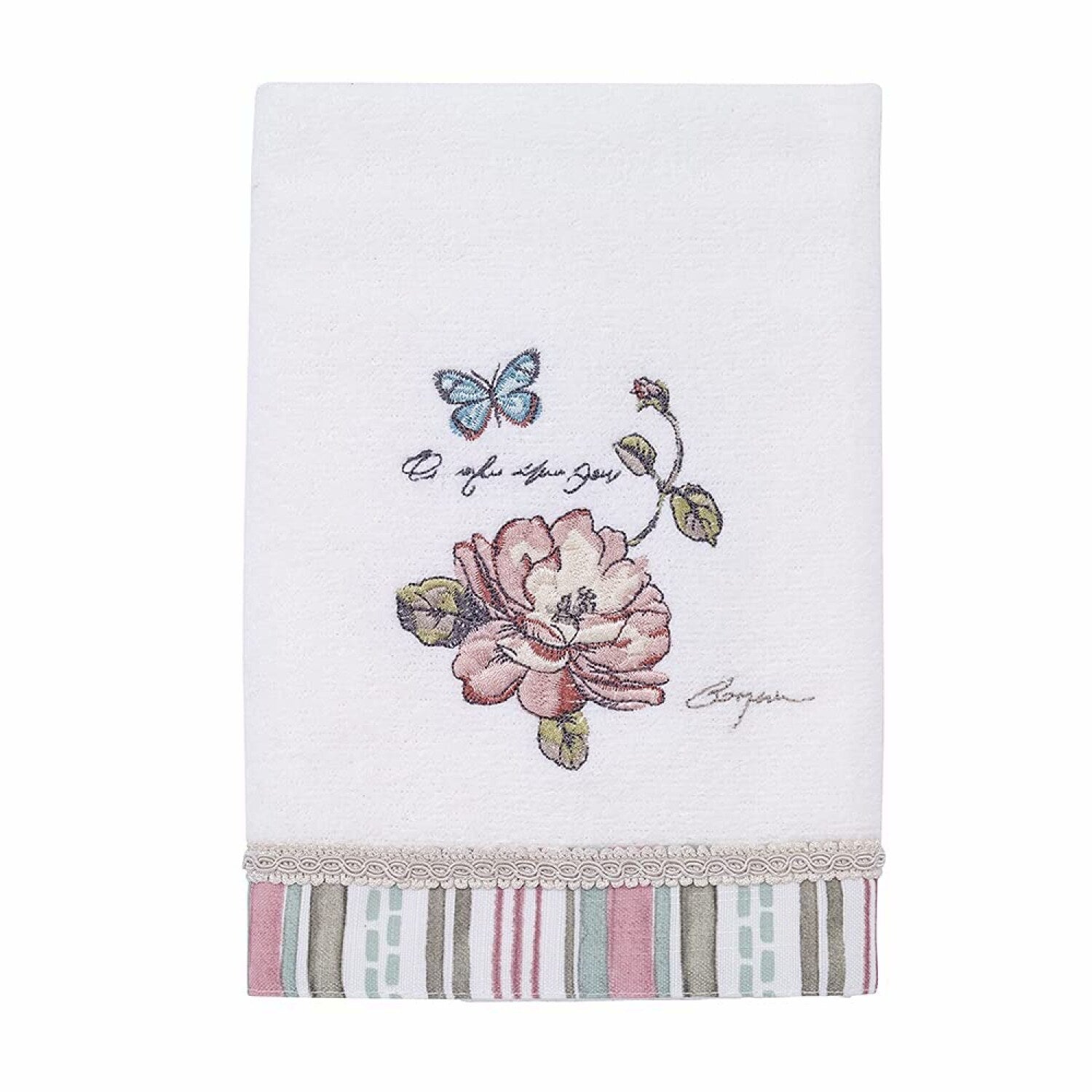 This hand towel is made from soft, absorbent 100% cotton velour, providing a plush feel and effective drying. It features intricate embroidery of a pink rose with green leaves, complemented by colorful butterflies and words, adding a decorative touch. The towel is finished with a multi-colored striped border and braided trim, enhancing its visual appeal. Designed to bring a charming, garden-inspired aesthetic to your bathroom decor, it offers both functionality and elegance. The collection includes bath and hand towel sizes, all adorned with the same detailed embroidery and decorative elements. The embroidered butterflies are artistically rendered in pastel shades, appearing to alight on blooming roses, creating a whimsical and serene garden scene. Perfect for adding a touch of nature-inspired beauty to your bathroom, this towel combines softness, absorbency, and decorative detail in one charming piece.