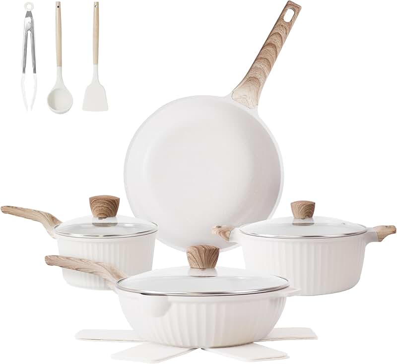 This set includes five kitchen utensils with handles, made from heat-resistant stainless steel. It features spoons, ladles, and forks designed for cooking and serving. The utensils are suitable for use with nonstick cookware and are ideal for home cooking or outdoor camping.