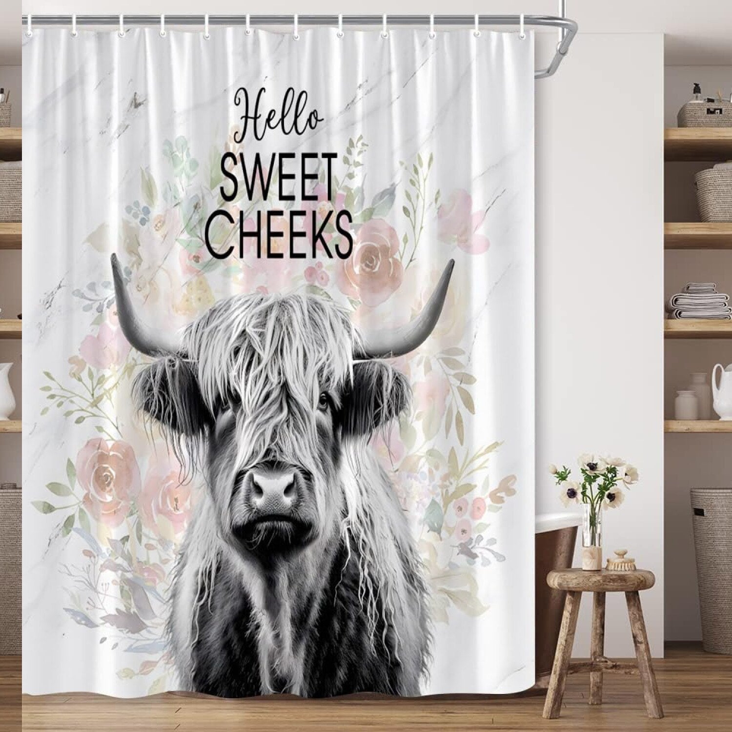 This Highland Cow shower curtain features a charming rustic design with a detailed Highland Cow print complemented by pink and wildflower floral patterns. The combination of rural wildlife imagery and delicate floral accents creates a unique and stylish look, adding a touch of countryside charm to your bathroom. Made from durable polyester fabric, the curtain offers easy installation and a charming vintage flair. Its design balances rustic and floral elements, making it suitable for various decor styles. The playful "Hello Sweet Cheeks" slogan adds a humorous touch, enhancing its personality. Perfect for those who appreciate naturalistic and country-inspired decor, this shower curtain brings a cozy, rural vibe to any bathroom space. Its versatile design and quality materials make it a delightful addition for anyone looking to infuse their bathroom with rustic elegance and a hint of whimsy.
