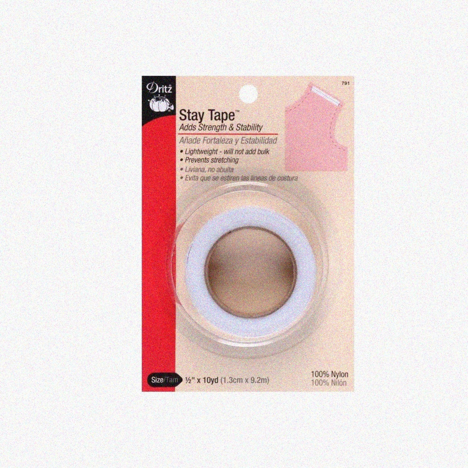 QuickFix Stay Tape measures 1/2 inch by 10 yards and is designed to add strength and stability to fabrics. It is ideal for stabilizing and reinforcing various areas such as waistlines, curved necklines, shoulder seams, side pocket openings, lapel roll lines, and gathered seamlines. The tape can be stitched onto seamlines to prevent stretching and maintain shape. It can be cut to size without fraying and will not shrink during use. The tape is washable and dry cleanable, making it suitable for multiple applications. Each package contains 10 yards of white stay tape, providing ample material for various sewing projects requiring seam reinforcement and fabric stabilization.