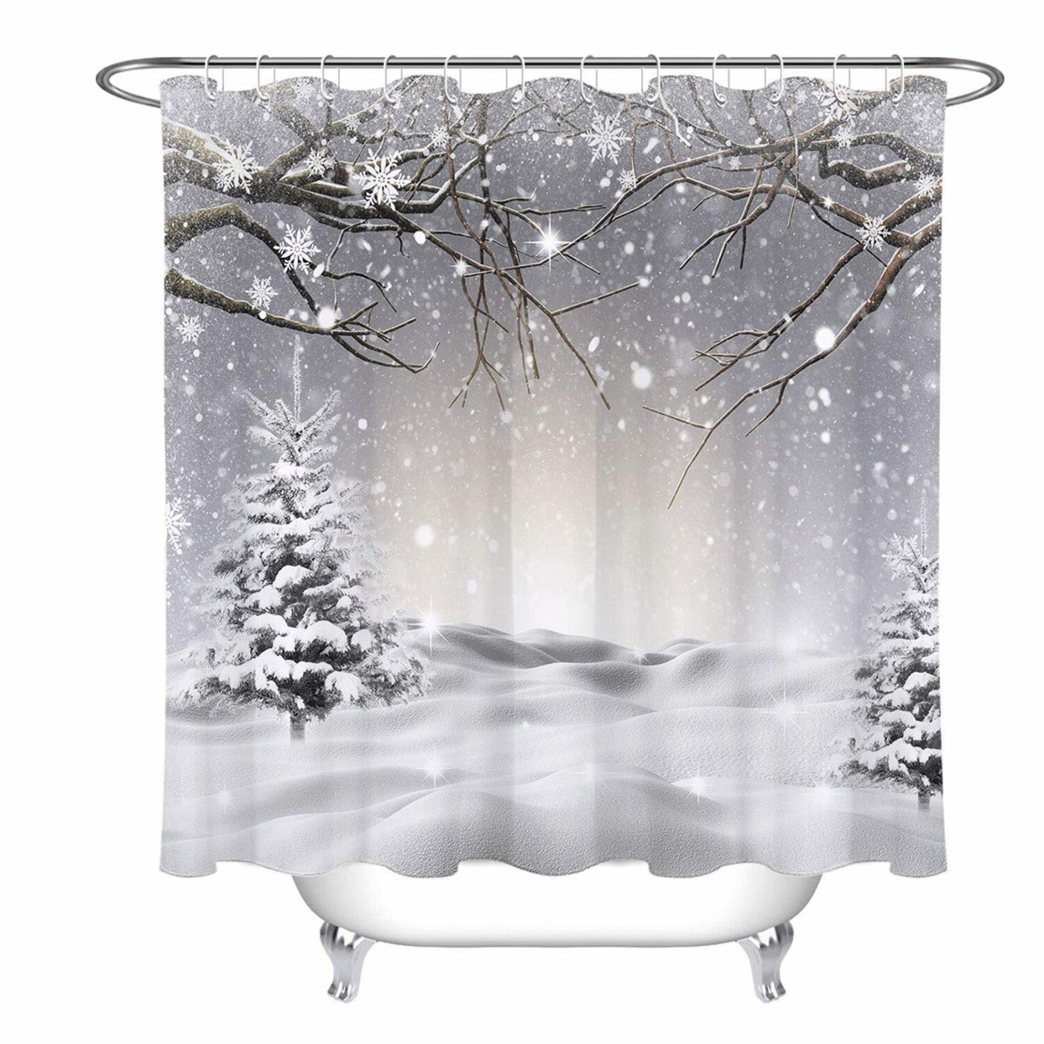 This waterproof polyester shower curtain measures 72 inches by 72 inches, fitting most standard shower stalls or bathtubs. It features a snowflake, pine tree, and snow scene design, adding a touch of winter charm to your bathroom decor. The curtain includes 12 hooks for easy installation. Its waterproof and quick-drying fabric prevents water spray during showers, maintaining a dry bathroom environment. The curtain is not too thin or thick, eliminating the need for a liner. Versatile in use, it can also serve as a door, kitchen, or window curtain, wall art, tapestry, photo backdrop, tablecloth, or party decor. The design is environmentally friendly and healthy, with a focus on current trends and home fashion. It offers a beautiful, unique look that can refresh your bathroom and brighten your day. Please note slight color variations may occur due to display differences.