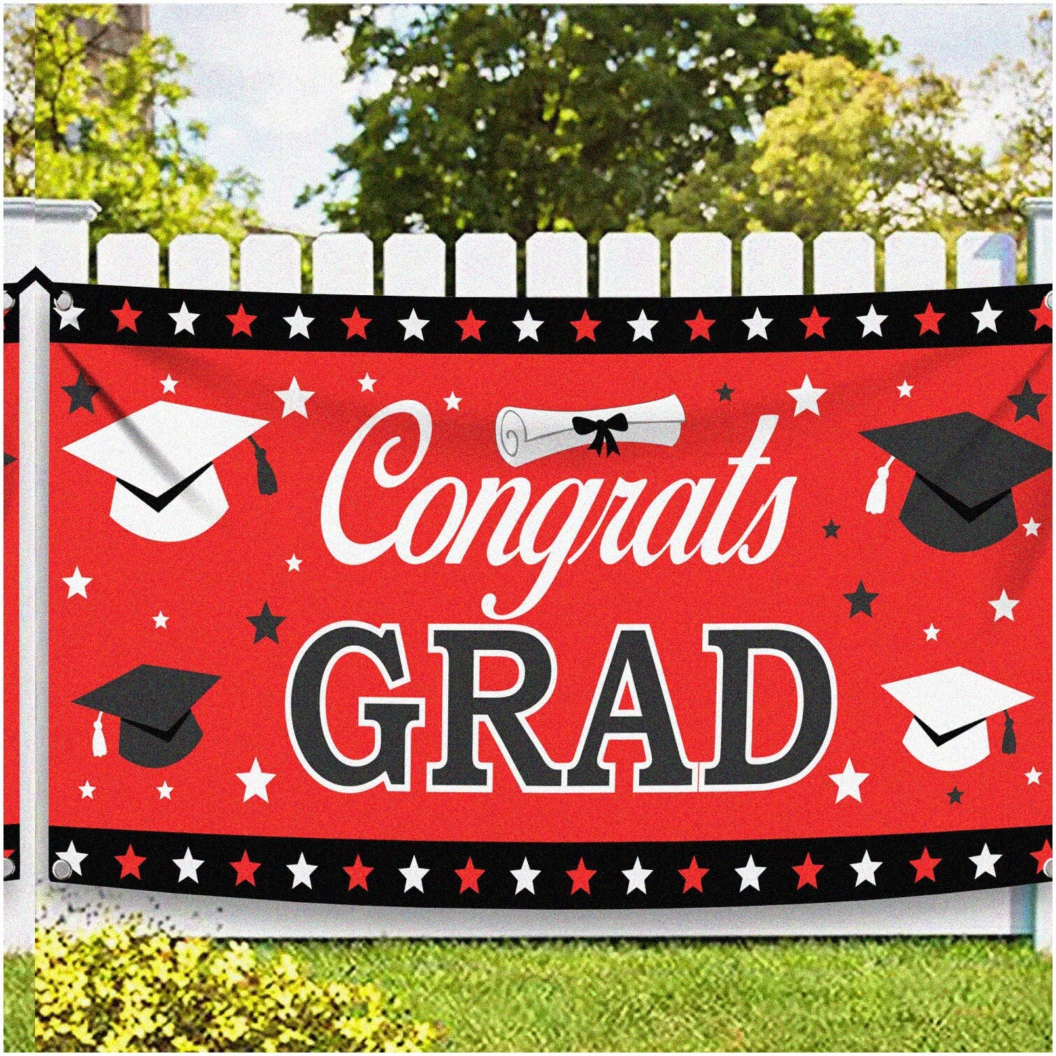 Celebrate success with this jumbo 72x44 inch red graduation banner, perfect for 2024 celebrations. Crafted from durable fabric, it withstands weather conditions and is washable for reuse. The vibrant red color symbolizes achievement and energy, making it an eye-catching backdrop for photos and events. The banner features rings on each corner, allowing easy hanging anywhere—indoors or outdoors, on walls or fences. Its large size ensures it commands attention and adds grandeur to your graduation party or ceremony. Suitable for various occasions, including college, preschool, or eighth-grade graduations, this versatile decoration enhances any celebration with a touch of elegance. The black ribbon roll included, measuring 20 feet, offers additional display options. Whether used as a main backdrop or a decorative accent, this banner guarantees to bring joy and a radiant glow to your special event. Make your graduation memorable with this striking red congratulatory banner.