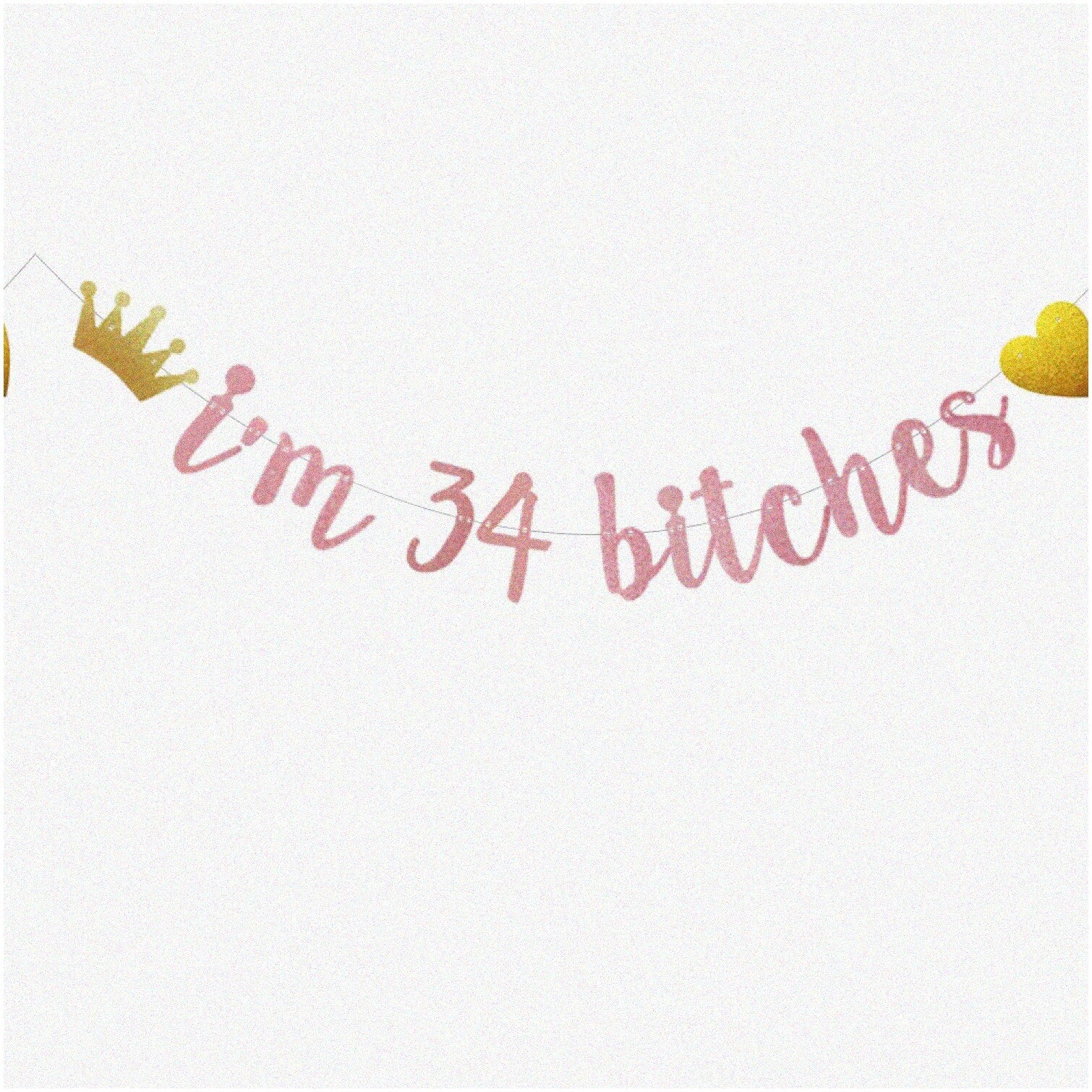 Celebrate in style with this dazzling rose gold glitter paper banner that boldly proclaims "I'm 34, bitches!" Perfect for adding a fun and glamorous touch to any 34th birthday celebration, this banner features an eye-catching glitter finish and vibrant rose gold color, creating a festive and chic vibe. Designed for versatility, it suits various settings such as gardens, kitchens, and homes, making it an easy addition to any party space. The banner comes pre-strung on nine sections, requiring no assembly, allowing for quick and effortless setup. Whether celebrating with friends or family, this lively decoration enhances the joyful atmosphere and adds a humorous, celebratory flair to the event. Itβs a fun and stylish accessory that helps make the birthday girl or woman feel special, ensuring the occasion is memorable and filled with laughter.