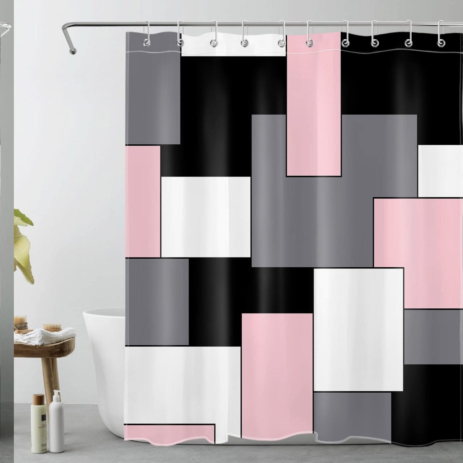 This modern pink shower curtain features a grey, black, and white abstract geometric design, adding a contemporary touch to your bathroom decor. Made from high-quality polyester fabric, it offers a soft, smooth, and flowing texture that enhances comfort. The curtain measures 60x72 inches, providing ample coverage to protect your privacy while allowing water to stay within the shower area. Its durable material ensures quick drying and resistance to fading, thanks to high-definition digital printing. The package includes one pink geometric shower curtain and ten plastic hooks for easy installation. Care is simple: it can be hand or machine washed in cold water, should be hung to dry in shaded areas, and ironed at low temperatures if needed. This stylish shower curtain is designed to create a comfortable and modern bathroom environment, combining functionality with aesthetic appeal.